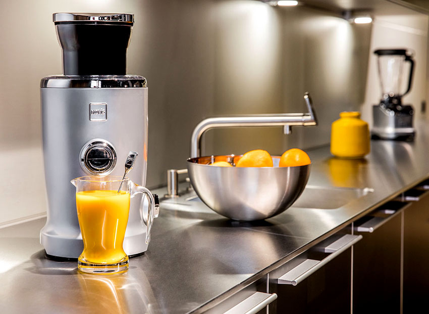 The multifunctional model is the Novis Vita Juicer, which can be used to prepare fruit and vegetable juices, purees or as a citrus juicer. Depending on the type of fruit on the unit, the desired operating mode is selected. The power of the device is 1500 W.