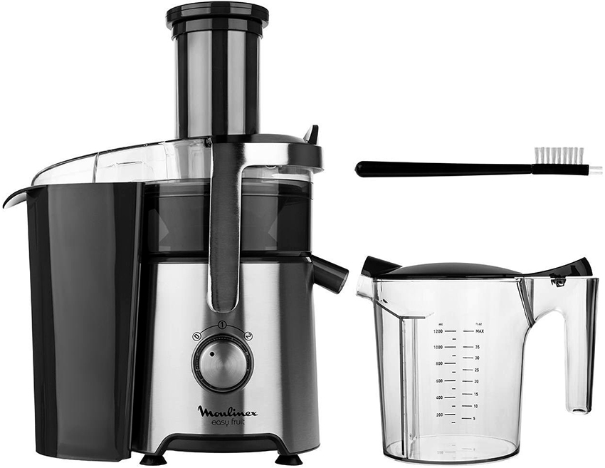 Opens the top centrifugal juicers for daily use, the 400W Moulinnex JU 2100. The device has a stylish design. Thanks to the wide mouth, the fruits can be loaded whole. The body is made of impact-resistant plastic and the cage mesh is made of stainless steel. The unit is easy to disassemble and assemble. The parts are dishwasher safe. The cost of the device is 3.9 thousand rubles.