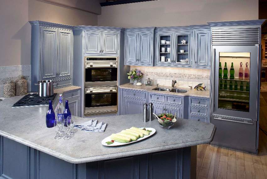 The beautiful arrangement depends on the availability of original containers, jars, aluminum stands for fruits and eggs. The glass door of the refrigerator must be kept perfectly clean so that guests can appreciate the beauty of the design in the kitchen interior.