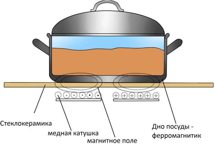 An induction coil with a copper winding is located under the glass-ceramic surface of the stove, through which an electric current flows.