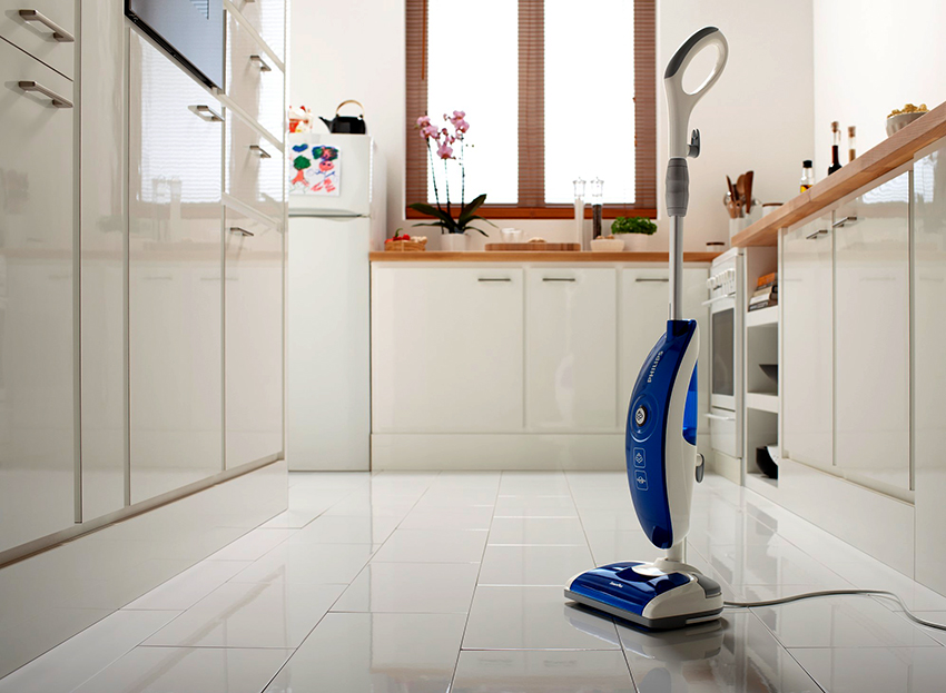 A popular clinker device for cleaning any surface is the Philips FC7020 / 01 steam mop with electric broom. The model is equipped with a large number of attachments. Has a built-in water filter, which allows you to use liquid of any quality. The volume of the container is 0.35 liters. The Philips steam mop develops a power of 1.3 kW. Based on the nature of the dirt, you can adjust the intensity of the steam supply. The device starts working after 30 seconds and will operate for 20 minutes. You can buy a model for 7.5 thousand rubles.