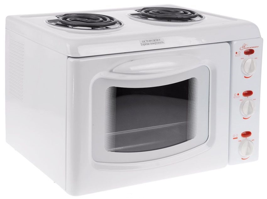 This household appliance looks like a microwave oven. The hob is positioned above ovenand both devices have a single control system. Mostly such a device is equipped with two burners. The surface can be enamel or glass-ceramic. The main advantage of such models is the extended set of functions. The device is necessarily equipped with a backlight, a steam extraction option, a self-cleaning system, a pull-out trolley and a heat indicator.