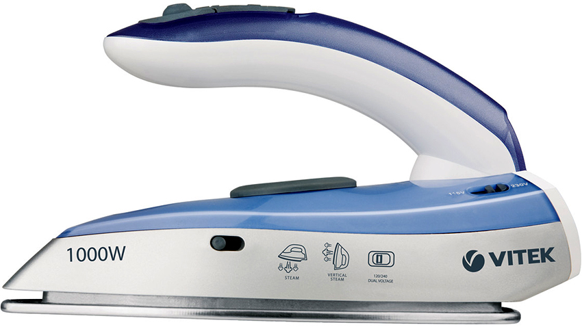VITEK VT-1227. Powerful device (1000 W), which is designed for both dry and wet ironing using steam. There is a special groove on the sole for convenient bypassing the buttons. Main advantages: