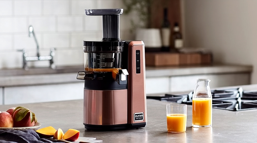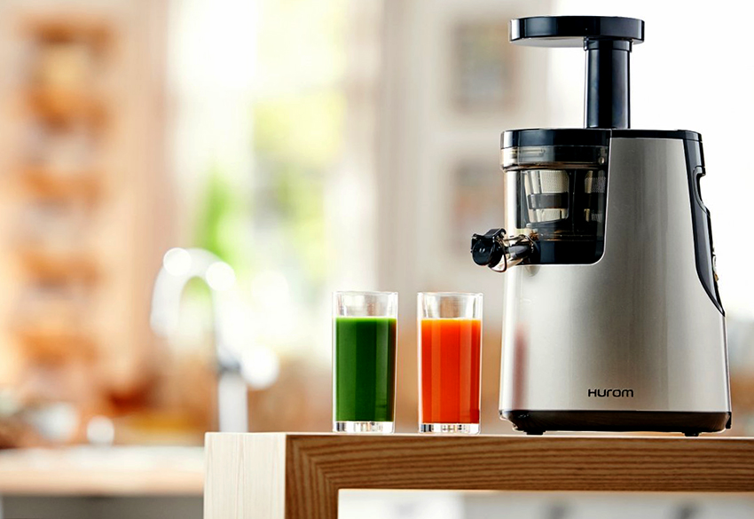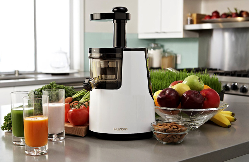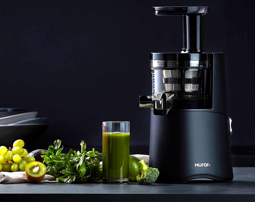 One of the best horizontal auger juicers is the multifunctional model Hurom GI Series GI-SBE0. The device easily handles the processing of hard fruits and vegetables, as well as herbs. Thanks to the extended set of attachments with this model of the juicer, you can make fresh, sorbet, nut butter and noodles.