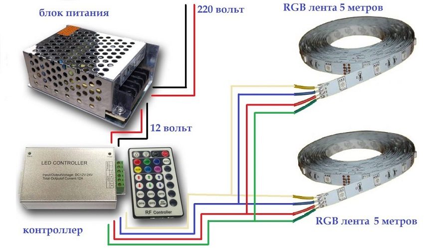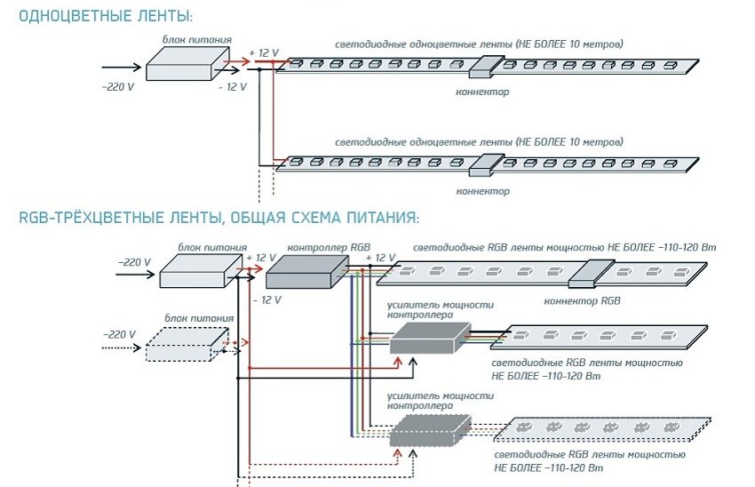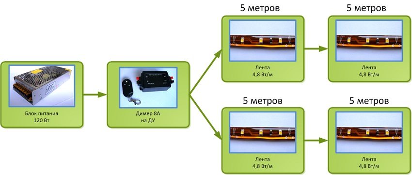 The above example of a diagram for connecting an LED strip to a power supply unit is suitable for using backlighting from one strip up to 5 m long. If you need to connect several pieces of tape, then you must use a parallel connection scheme.