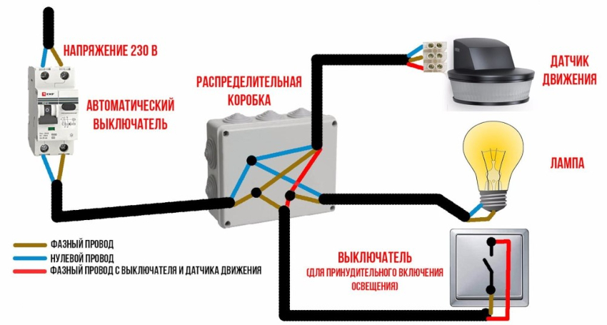 Important!The wiring diagram for a motion sensor with a switch involves connecting the device, switch and lighting in parallel.