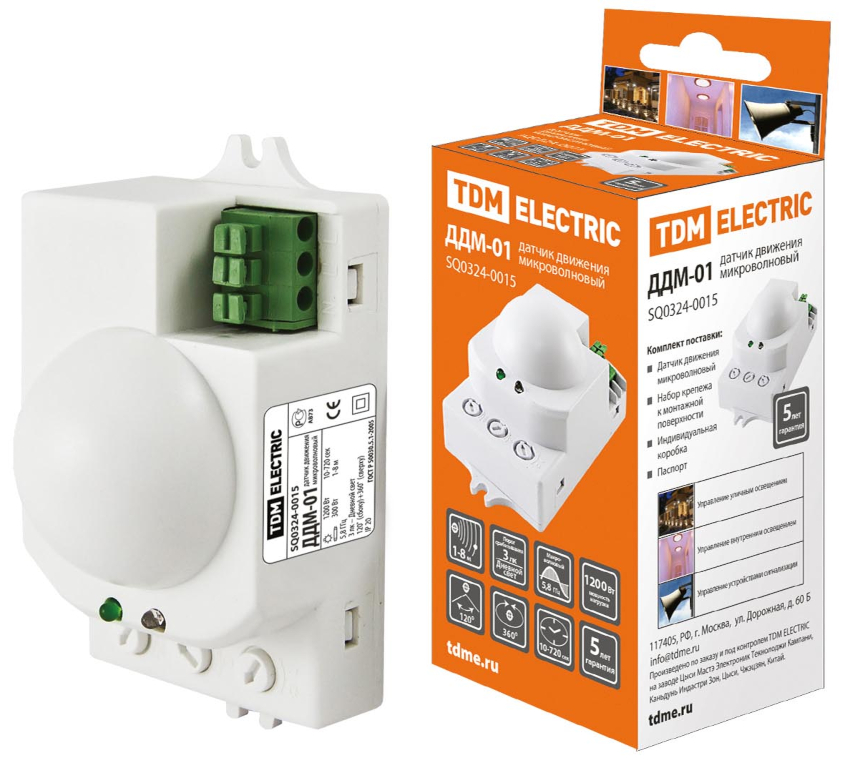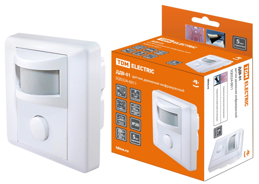 The infrared motion sensor of the wall-ceiling type IEK deserves attention. Thanks to the IP44 protection class against adverse conditions, the device can be installed outdoors. The range of the device is 10 m, the viewing angle is 120 °. You can buy a motion sensor for 400 rubles.