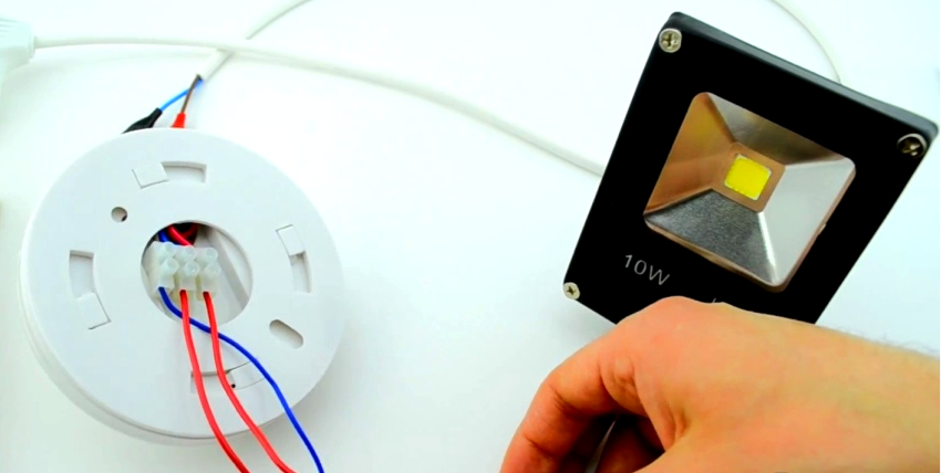 At the next stage, the motion sensor is installed with your own hands in the break of the supply wire. Based on the instructions that come with the device, it is necessary to pass the phase through the sensor to the light bulb and bring zero to it for power. The phase passes through the brown wire, exits the red one and is fed to the light bulb. The connections are made with a screw terminal.