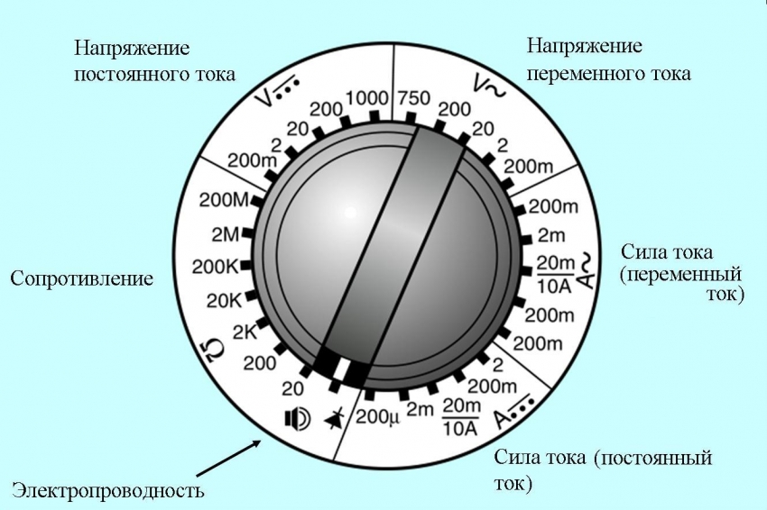 On the case of a digital multimeter (tester) there is a scale for the designation of the measured values and their maximum values. By turning the switch, you can select one of them: