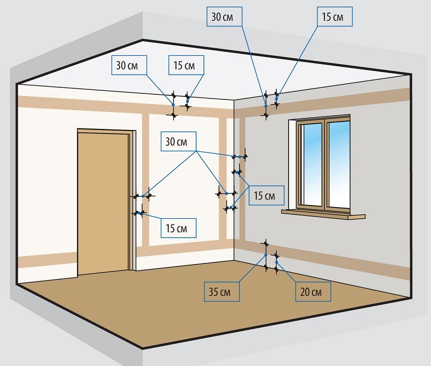 - the diagram shows the distance from the cable passage line to the opening of doors, windows, as well as the distance from the electric points to the floor and ceiling. In the future, this will help to avoid damage to the electrical wiring during repair work.