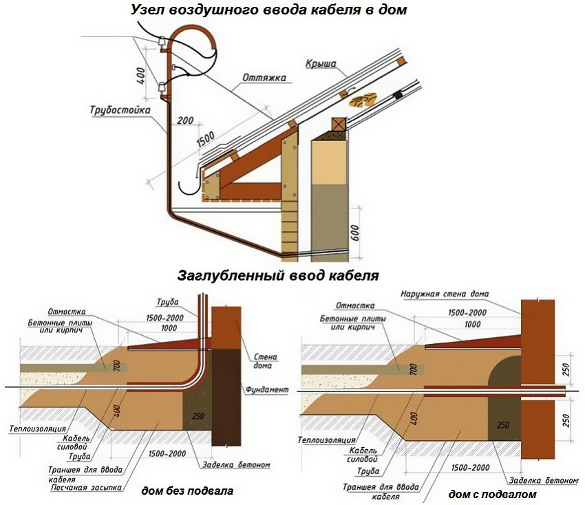 The lead-in cable can be brought into the room by air or underground. It should be noted that the air method is less costly, but not entirely reliable. In such cases, self-supporting insulated wires (SIP) are used. With the air method of inlet, a prerequisite is the installation of a fireproof sleeve in the wall through which the inlet will pass.