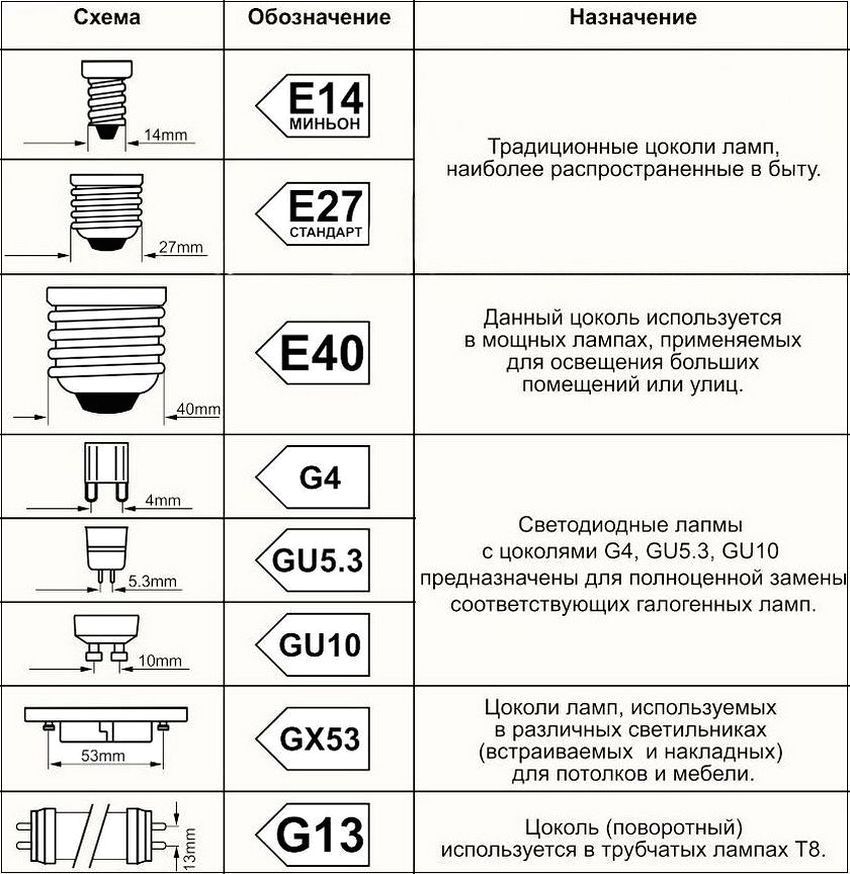For the convenience of using LED products in a home network, devices are available with various standard base options. This allows you to effortlessly replace old lamps with modern LED lighting sources. Basic types of plinths: