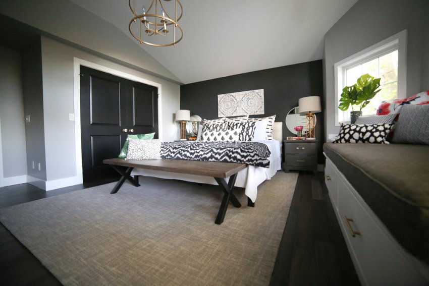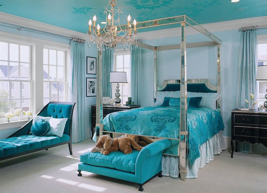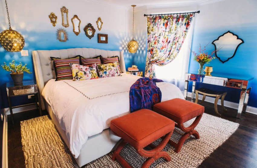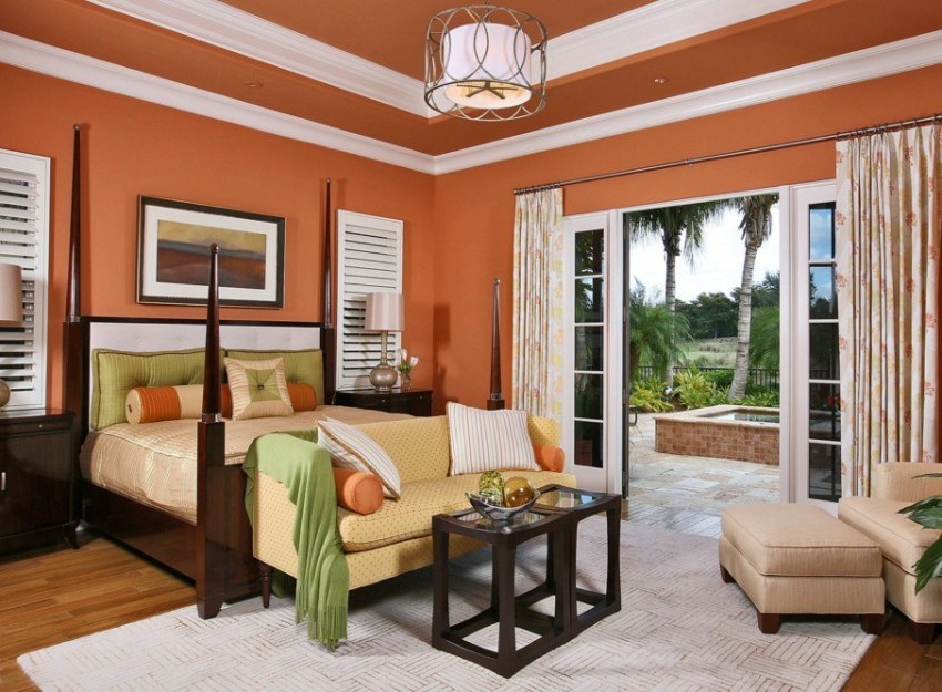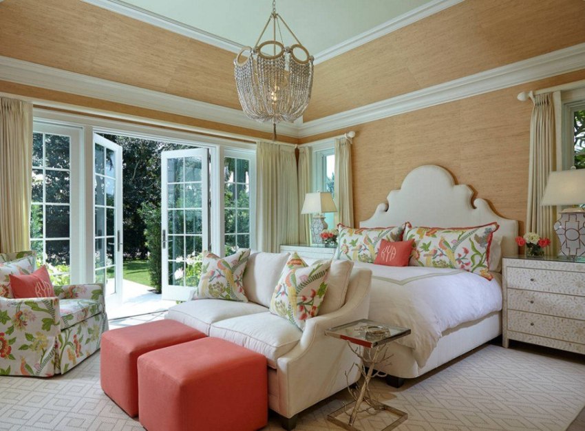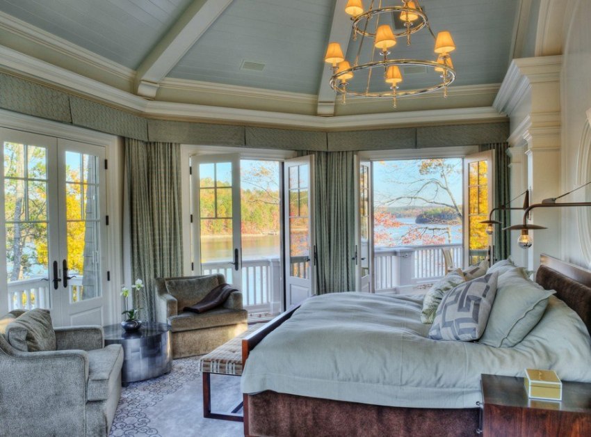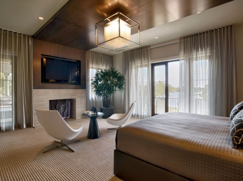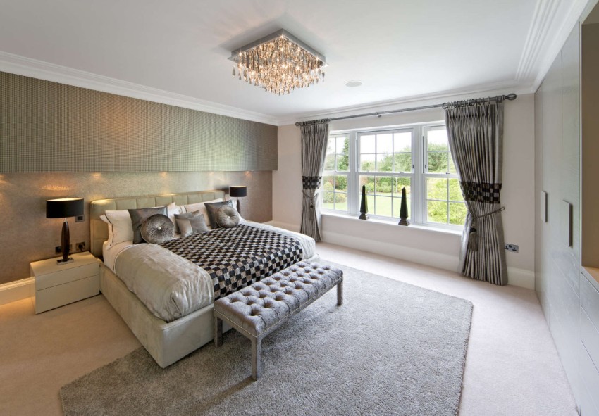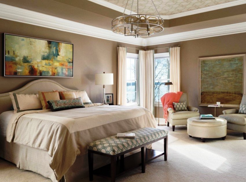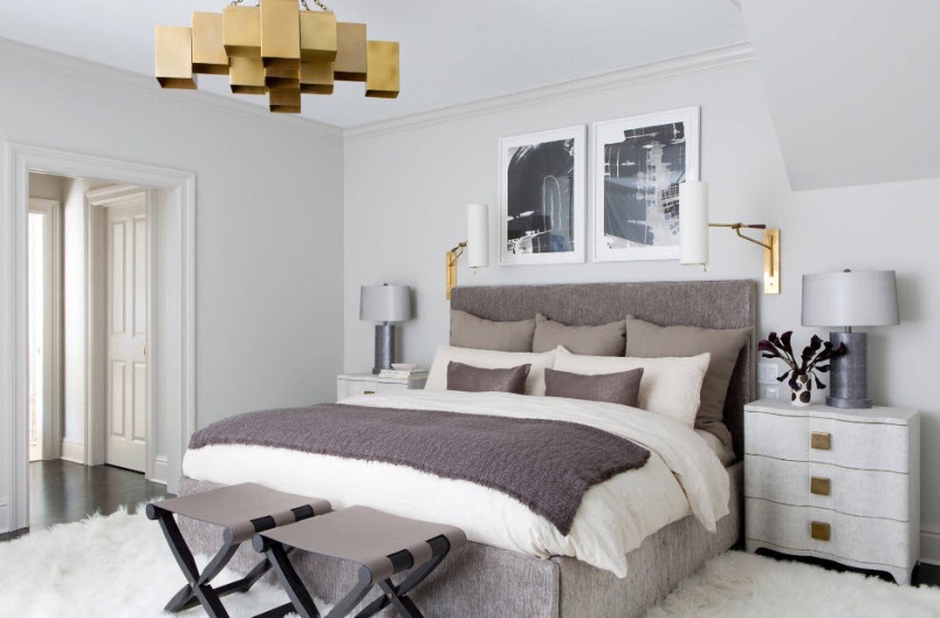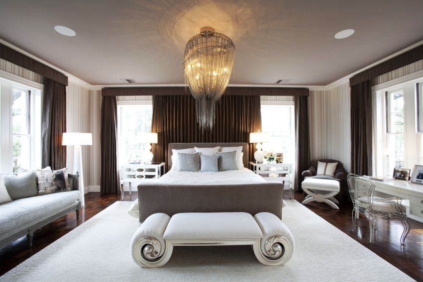 Often, designers offer such projects of rooms where the chandelier is located not in the center, but directly above the bed.