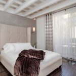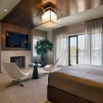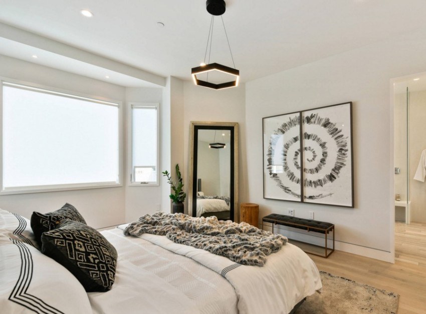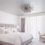 High-tech luminaires are distinguished by the presence of chrome-plated elements, flat glass parts. White chandeliers in the bedroom are organic for Art Nouveau. These are large plafonds attached directly to the ceiling and have a peculiar shape. For example, they can simulate a roll, honeycomb, oblique cut of several connected pipes. For a bedroom made in this style, ceiling lamps-frames or models slightly removed from the ceiling, where a flat element plays the role of a reflector, are suitable.