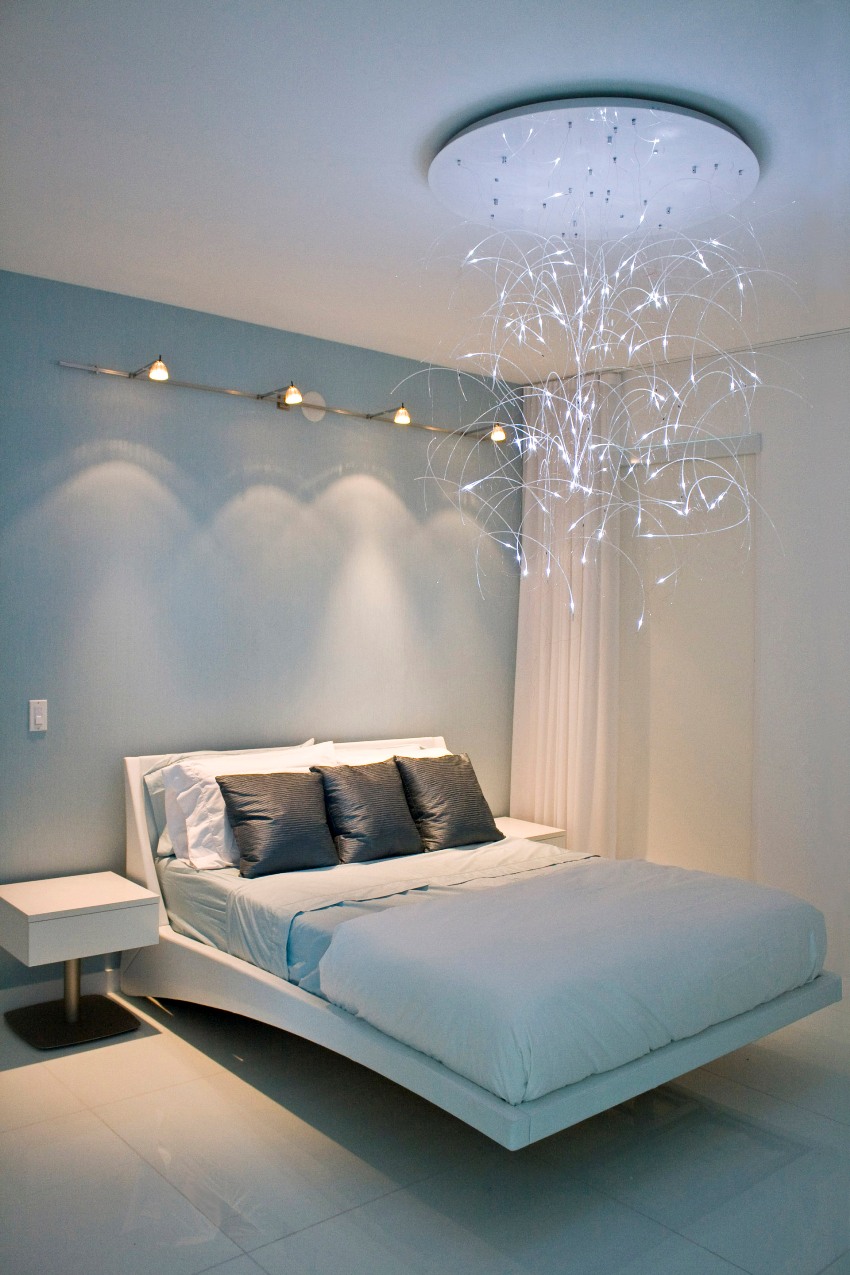What kind of chandeliers in the bedroom have modern designers prepared for supporters of bold interiors? Photos on the Internet offer a variety of types of products that do not have a significant reinforcement part. It is replaced by soft cords-wires, on which shades with lamps and decorative reflectors, which are flat geometric shapes, are suspended. Such lamps do not look heavy, which is especially important for a room such as a bedroom. These options are acceptable for all cutting edge styles.
