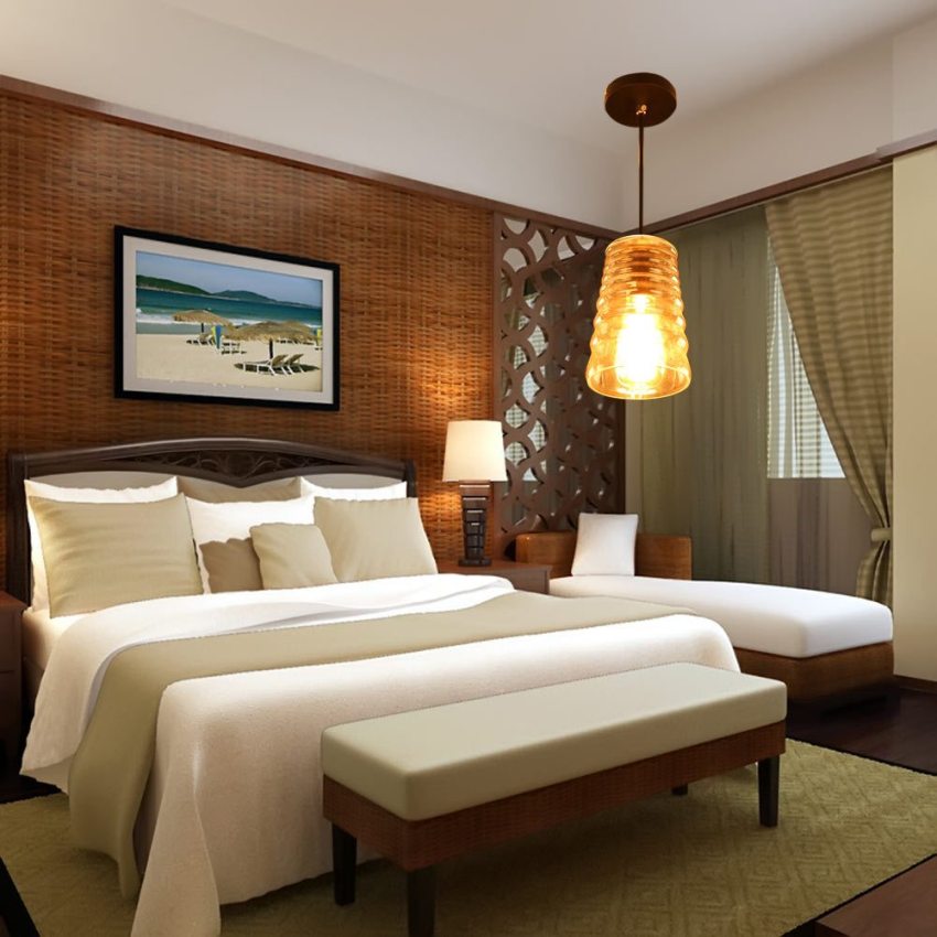 You should be very careful when hanging lamps with fabric shades. Here, harmony with the bedroom textiles is needed. Silk bedspreads, satin cushions, velor curtains will not match the fabric structure of the lampshade.