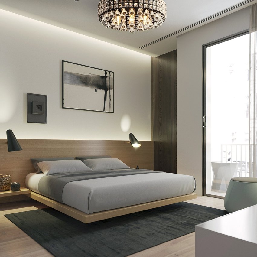 - It is better if chandeliers in bedroom interiors, made in minimalist styles, will give decentralized lighting. This is typical for this stylistic trend.