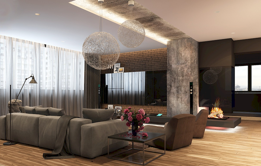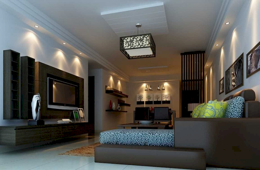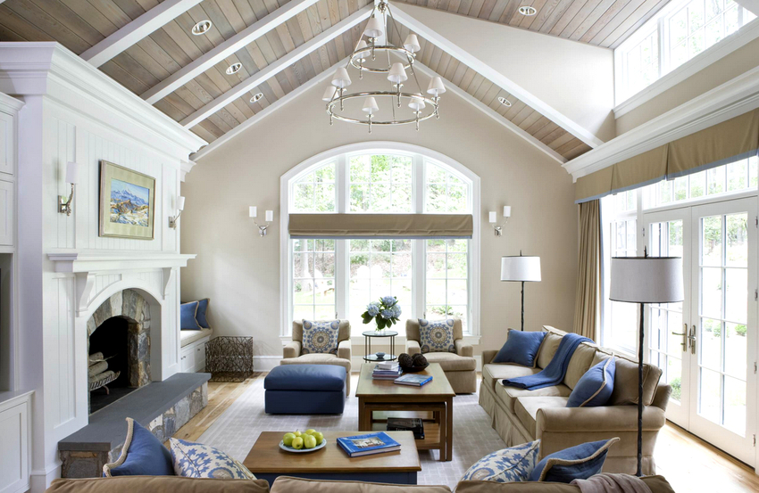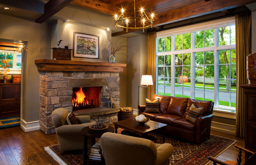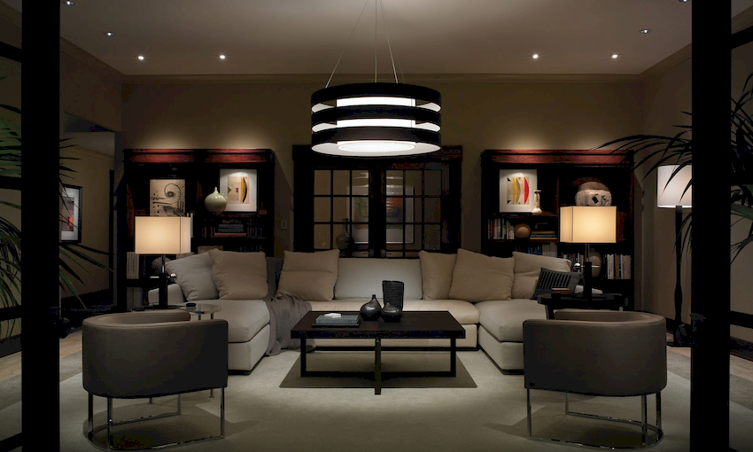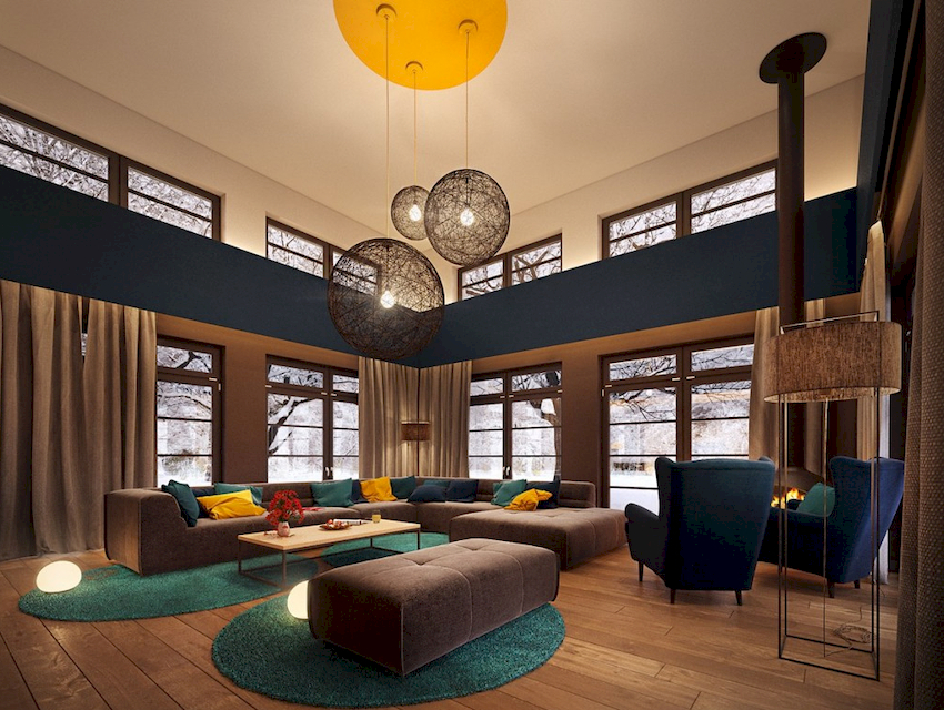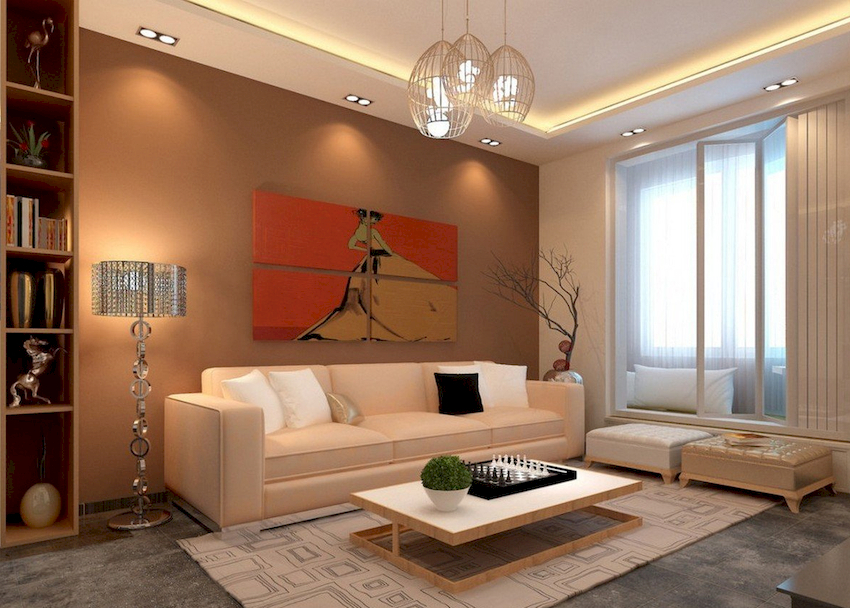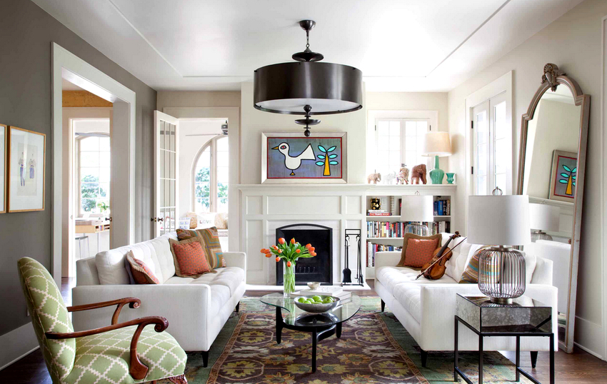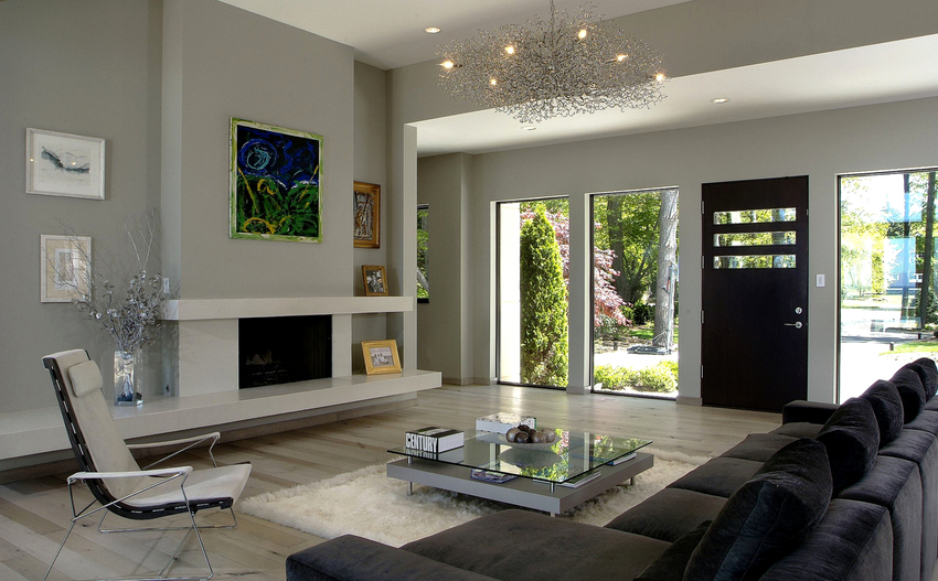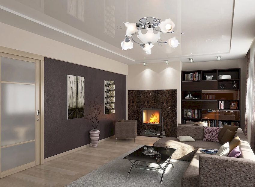 The intensity and method of lighting are selected depending on the functionality of the zones. The ceiling chandelier in the living room does not have to be in the center of the room. It can be used to illuminate a soft area or a place near the fireplace. The location of the light source is determined by the furnishing of the room.