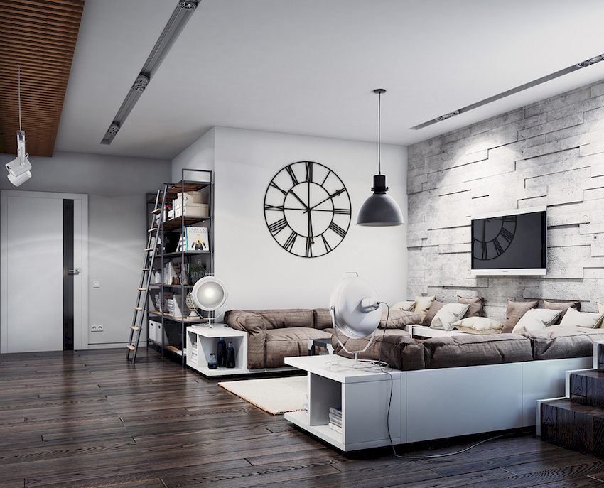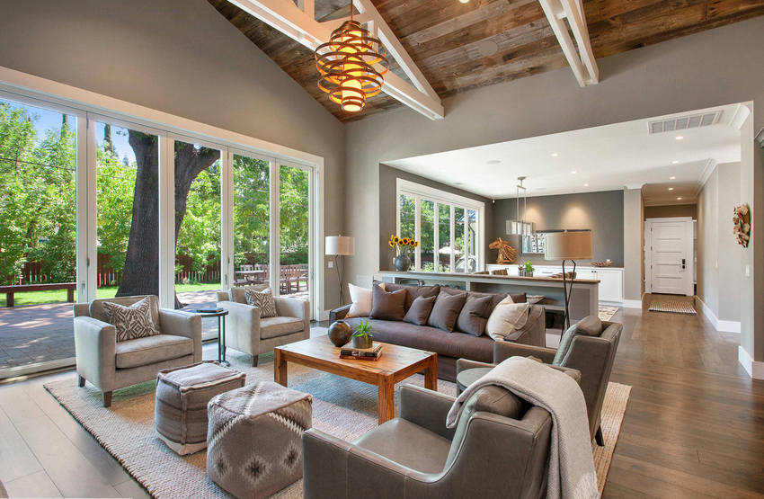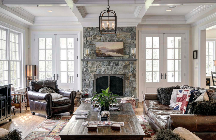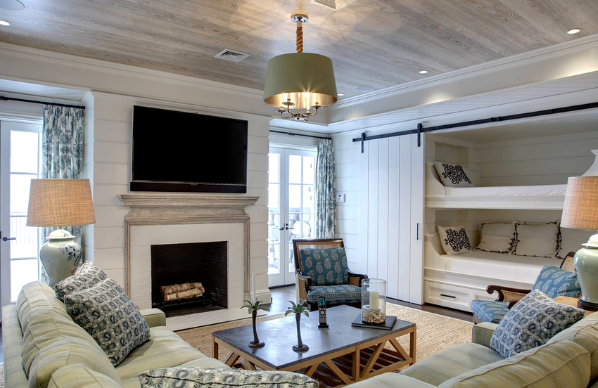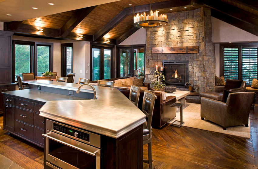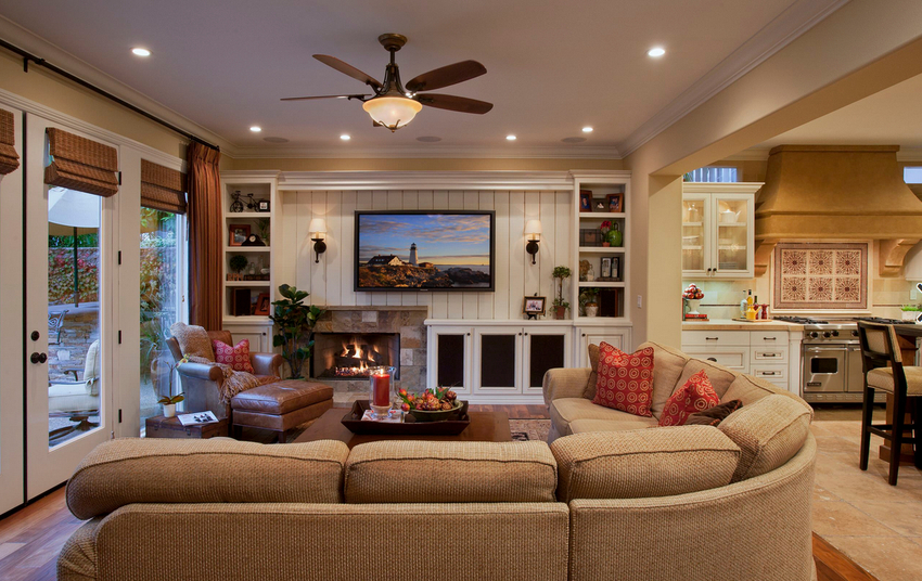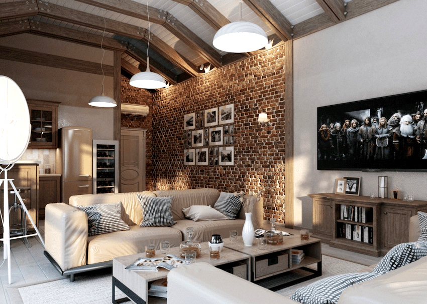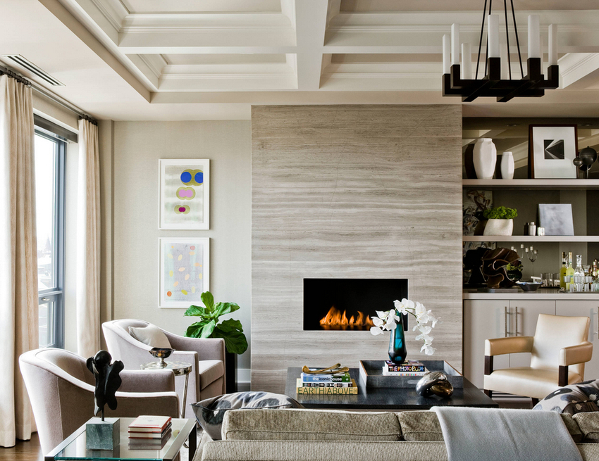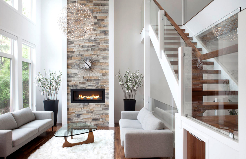 The intensity and method of lighting are selected depending on the functionality of the zones. The ceiling chandelier in the living room does not have to be in the center of the room. It can be used to illuminate a soft area or a place near the fireplace. The location of the light source is determined by the furnishing of the room.