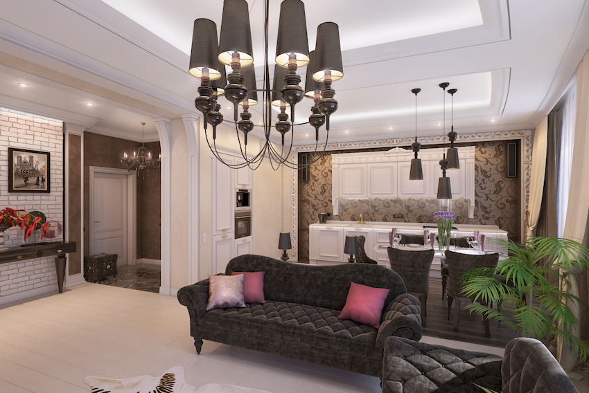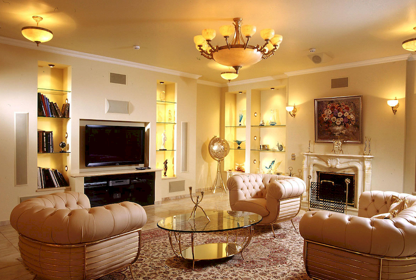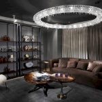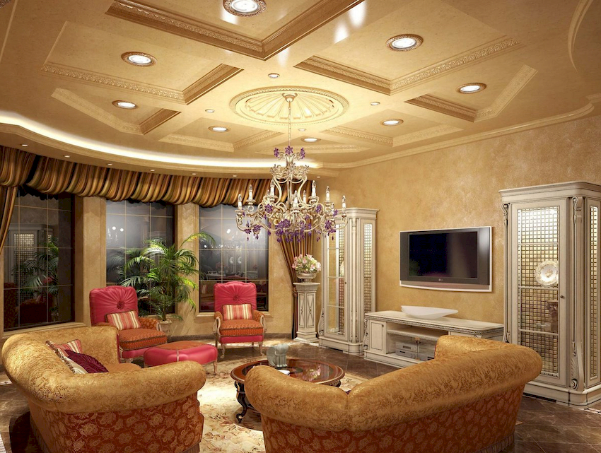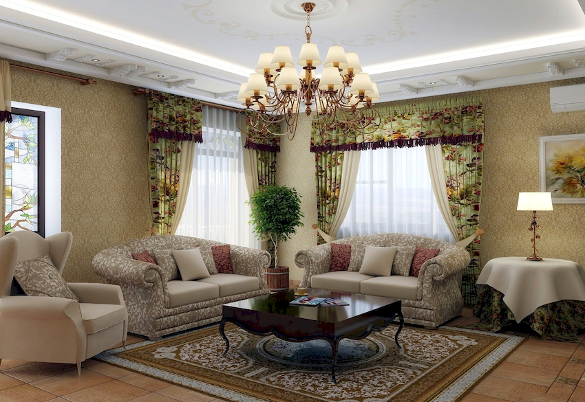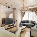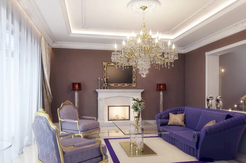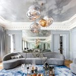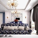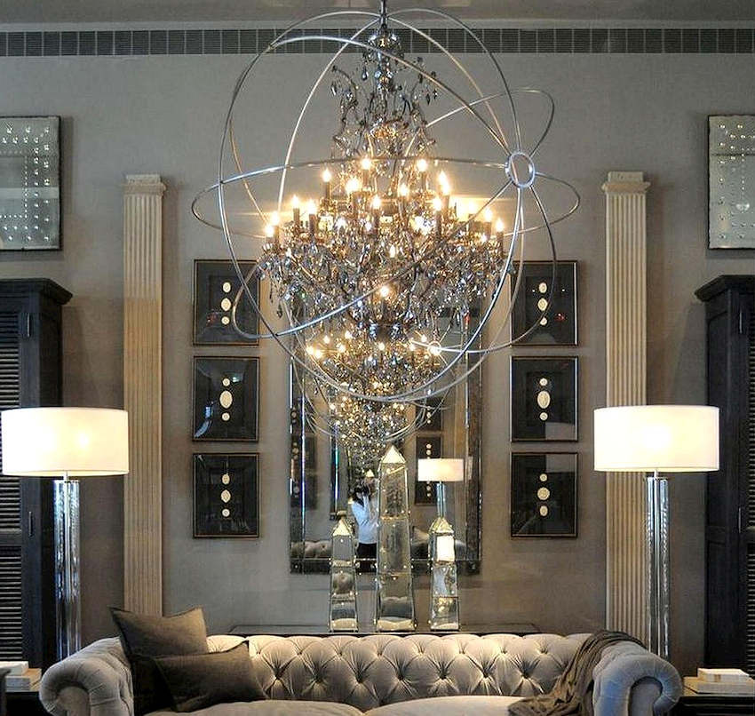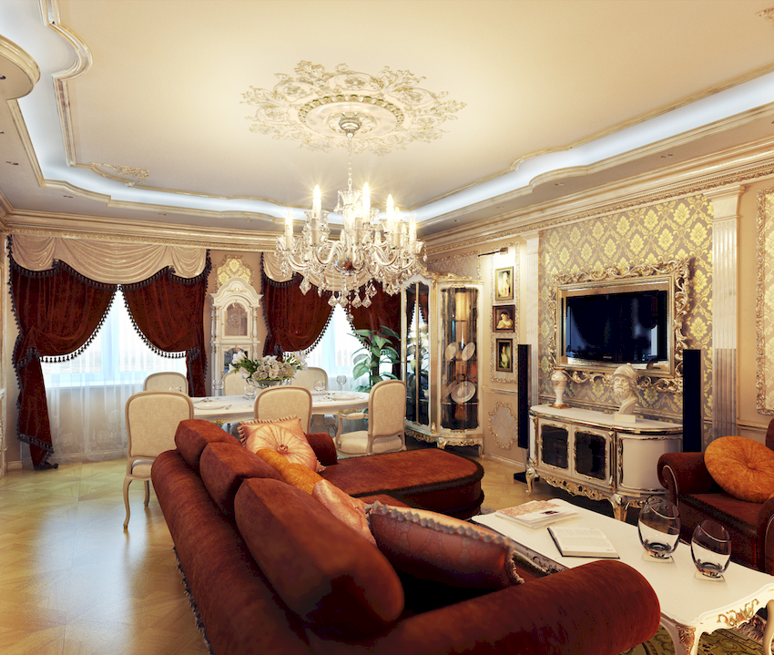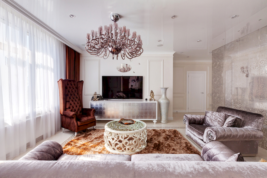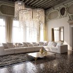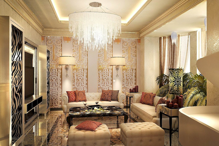 The Baroque style prefers grandeur and regality in all interior details. In such a room, it would be appropriate to look like a beautiful crystal chandelier in the living room with a wrought-iron frame, complemented by a variety of decorative pendants that illuminate the room with brilliance. An abundance of florid and lace lines is welcomed.