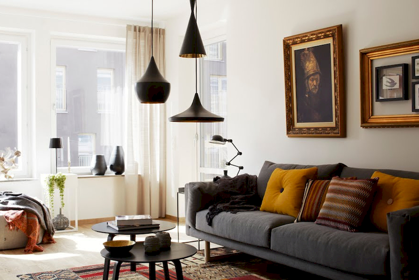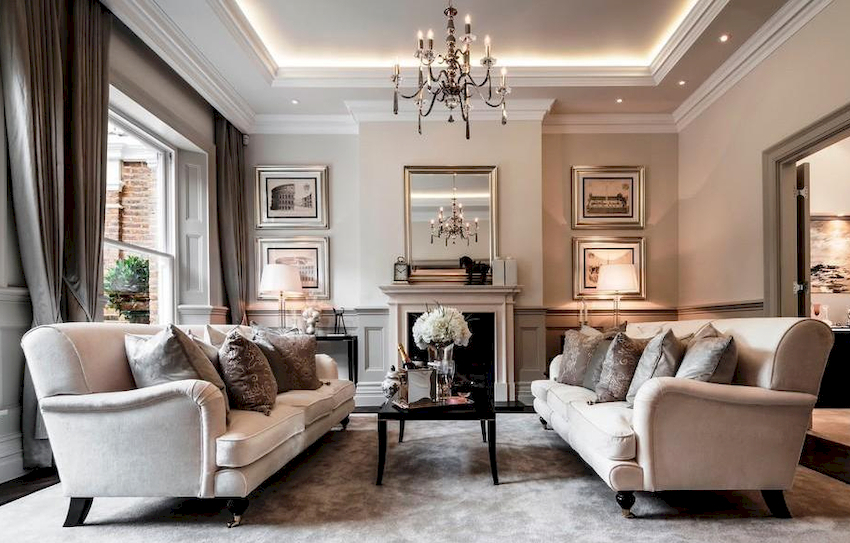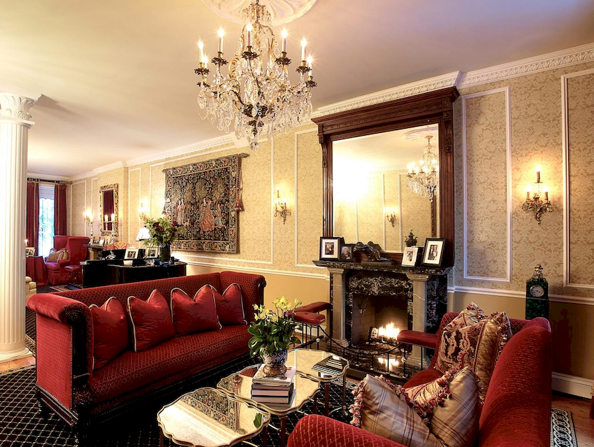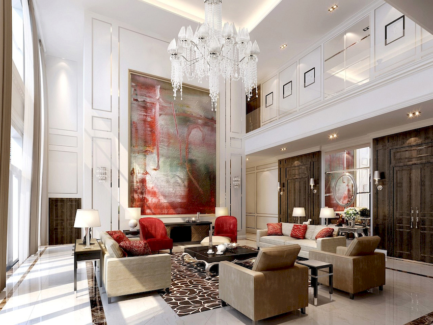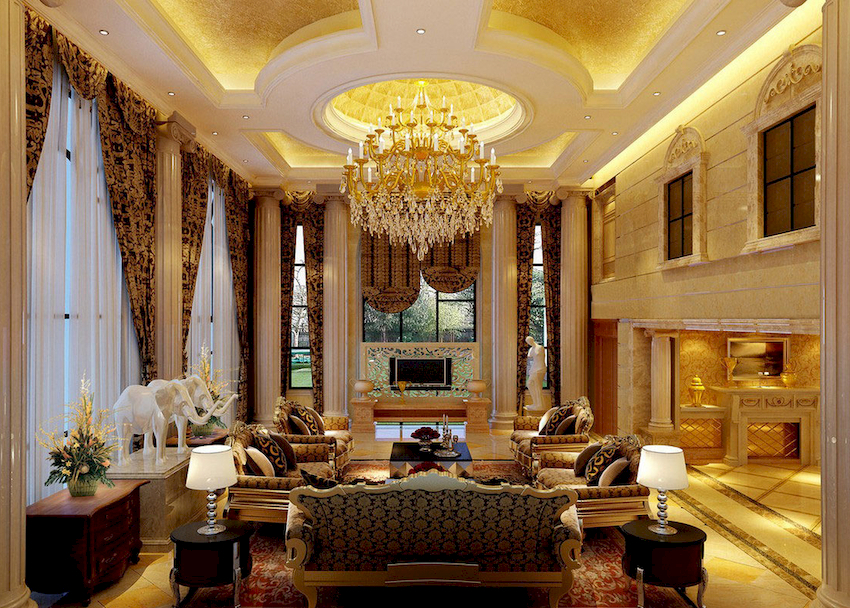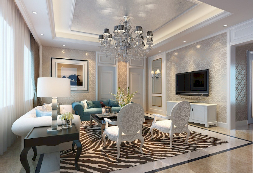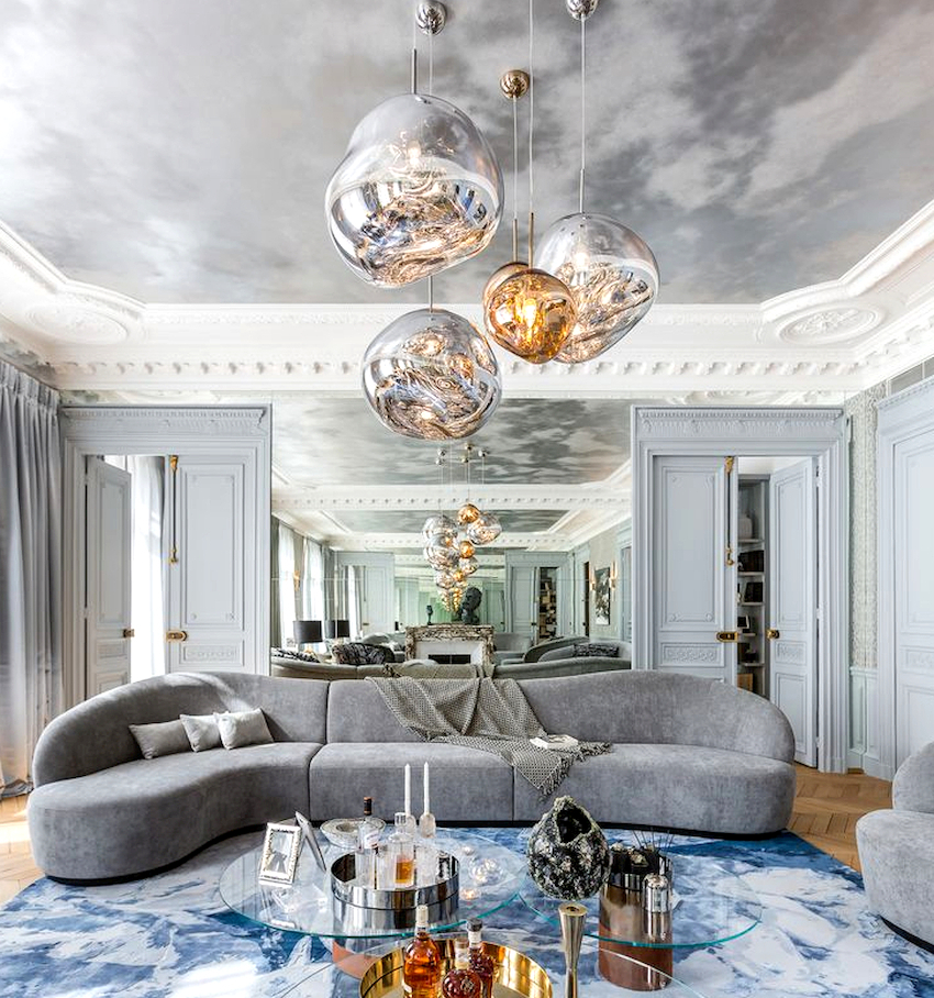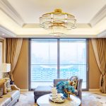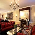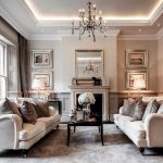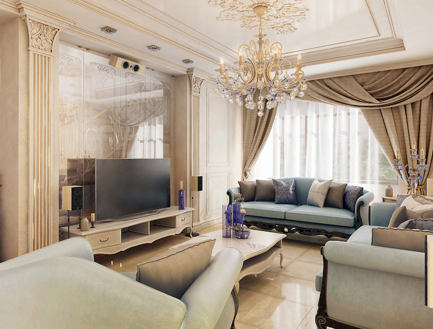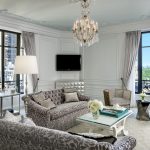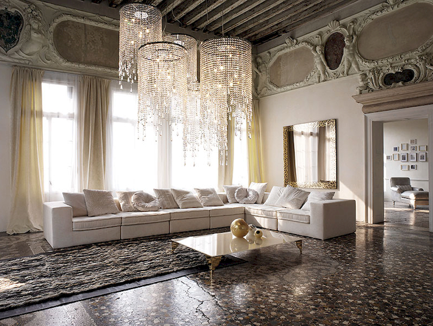 The Baroque style prefers grandeur and regality in all interior details. In such a room, it would be appropriate to look like a beautiful crystal chandelier in the living room with a wrought-iron frame, complemented by a variety of decorative pendants that illuminate the room with brilliance. An abundance of florid and lace lines is welcomed.