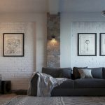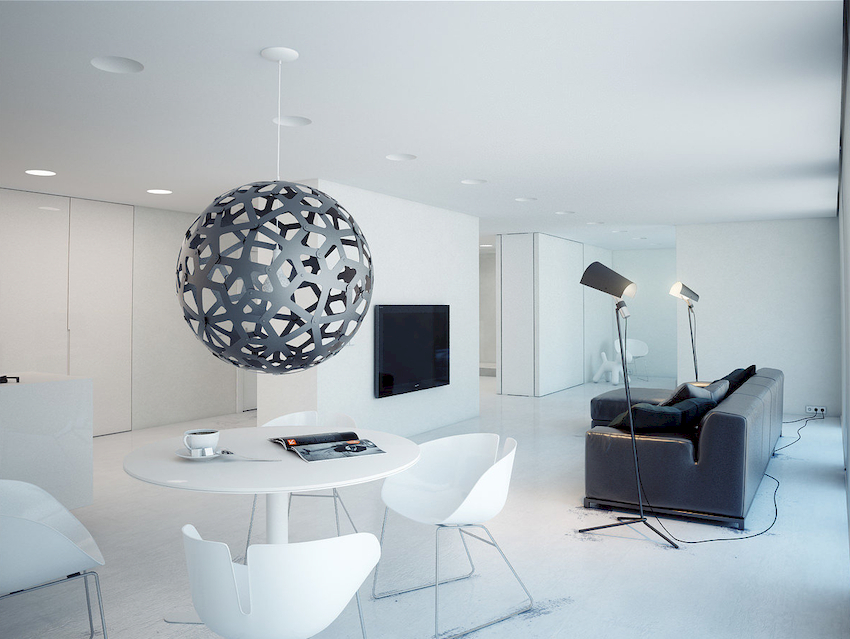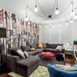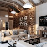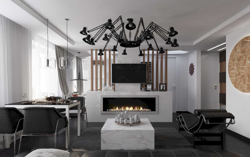 The ceiling chandelier will organically fit into the loft style into the hall of unusual design, which resembles a spider, with pendants made of wires and light bulbs at the ends. The wires have a flexible structure that allows you to change the location of the bulbs. Products in black will have the best effect. For minimalism, an expressive chandelier of a strict geometric shape, made in a monochrome shade, is suitable. Here, laconic products without decorative elements are welcome.