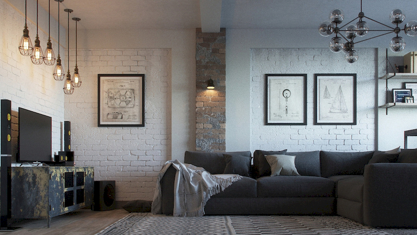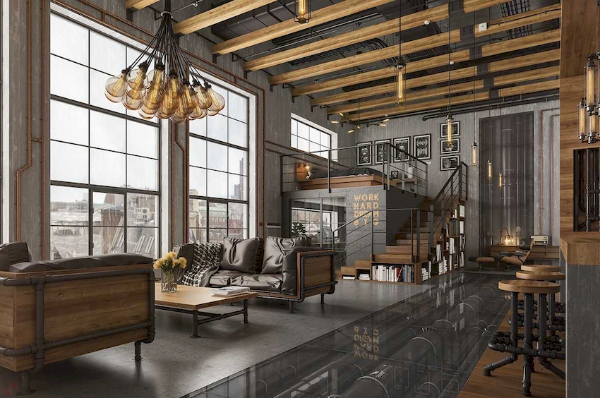 An unusual design ceiling chandelier will organically fit into the loft style, which resembles a wheel with lamps mounted in it.