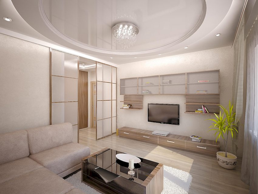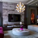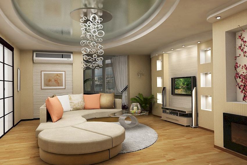 A round chandelier is able to add mystery and mystery to the interior. Photos of modern chandeliers in the living room emphasize the laconicism and sophistication of the models, which makes them suitable for most interior styles. The ring chandelier will become a real decoration of the room. It can be cascading, multi-tiered, and of various lengths. Choosing a chandelier in a living room with a low ceiling, you should give preference to flat options. This design does not overload the space.