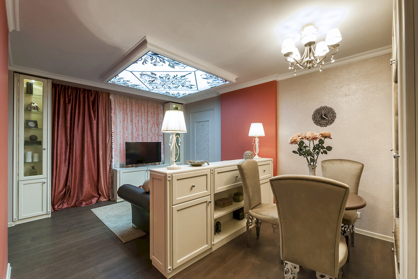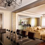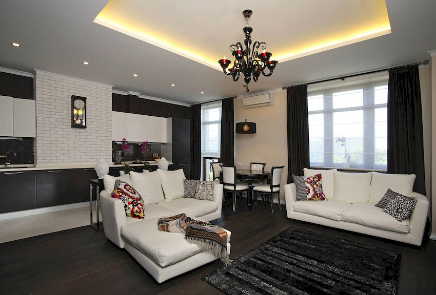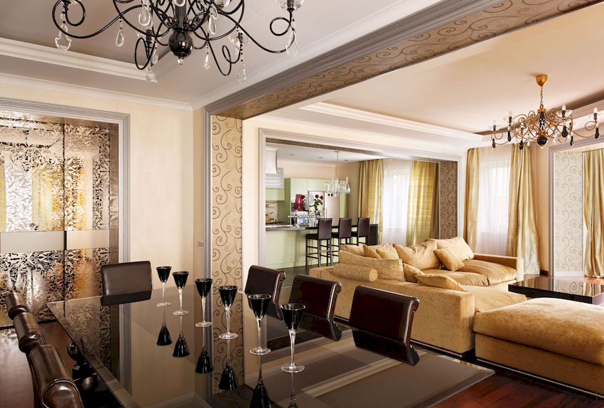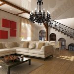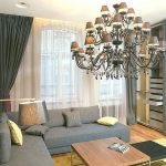 In spacious living rooms, a chandelier can be used for room zoning. In this case, you can arrange the same product options in each zone, which will give the interior an exquisite look, or combine one element with other light sources in the form of spotlights or wall sconces, which will make up a harmonious ensemble of objects of the same style.