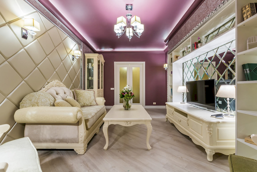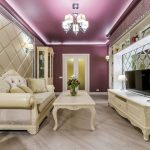 You should not purchase an overhead-type chandelier for a stretch ceiling in the living room in the form of a plate with a metal body, and variants of chandeliers with arms directed upwards are also excluded. This will cause black circles to form on the ceiling. Here, preference is given to structures in which the shades are directed downward or to the sides.