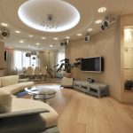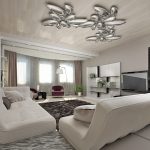 For a living room with a stretch ceiling, it is better to choose chandeliers with a large number of weak bulbs