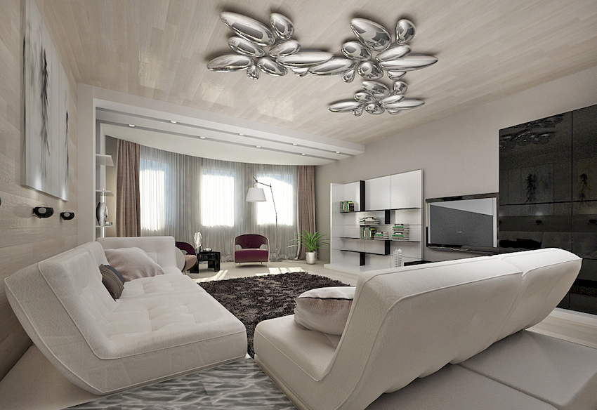 Chandeliers for the living room in a modern style are presented in a wide variety of species, which allows you to choose a lighting element in accordance with any room interior.