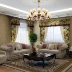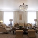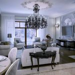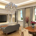 Chandeliers in the classic living room are represented by multi-track compositions with smooth lines. They are complemented by crystal or textile shades. Products in which shades imitate candlesticks with candles in combination with many pendants of various shapes and sizes look luxurious and presentable. This semblance of the old way of lighting allows you to capture the spirit of a bygone tsarist era. Classic chandeliers are made of metal, crystal, textiles and glass.