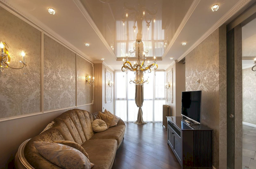 In the case of arranging a glossy ceiling, which, due to its reflective properties, is able to double the lighting effect, you can choose a chandelier with a minimum number of lighting points directed upwards. For such a chandelier, light bulbs with insignificant heat release are chosen, which will not damage the surface of the ceiling.
