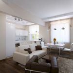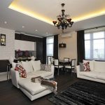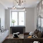 For a small hall, you can choose the same models of lighting fixtures of different colors. In this case, a chandelier in a light shade is installed closer to the soft zone, and a product in a dark design moves away to the end of the room. Different location options are shown in the photo of chandeliers in the living room interior.