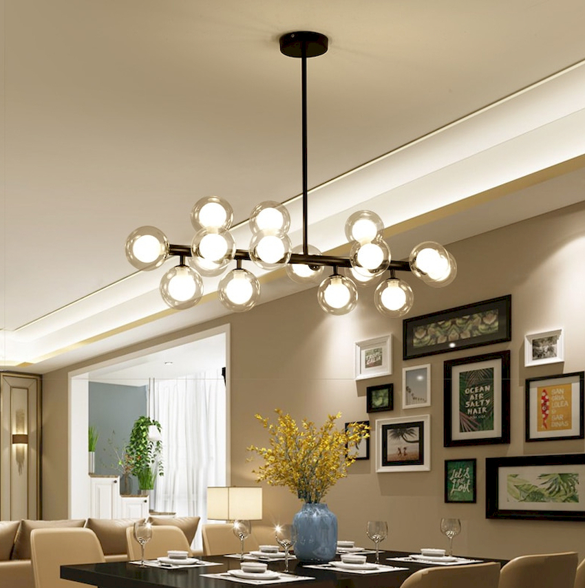 Modernity involves the use of progressive technologies that are unacceptable in traditional style. For such interiors, models of an unusual shape are suitable, where different materials are harmoniously combined. A popular option are Art Nouveau chandeliers in the living room, in which many small shades are located at the same or different heights on the strings, which form interesting light compositions.