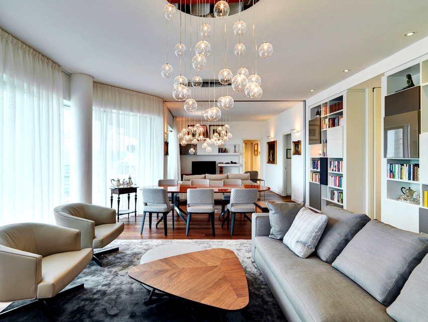 Spectacular chandeliers in the living room in a modern style