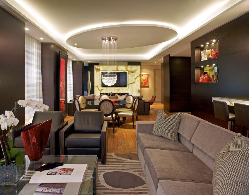 By adjusting the lighting, you can zone the room depending on the situation, highlight and highlight individual interior details