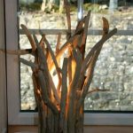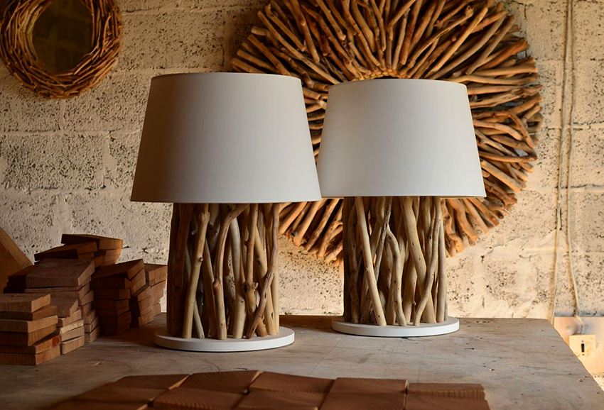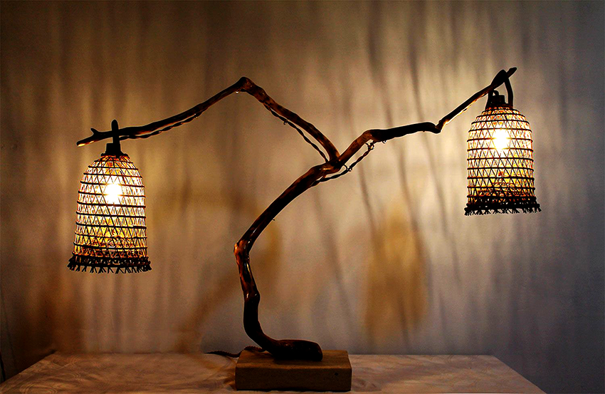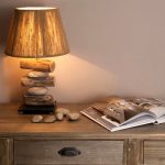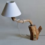 In addition, you can use a solid piece of wood, from which the bark is removed, and the surface is well sanded. A hole is drilled in the center of such a bar, a cable is pulled through it, on which a lamp is then attached. For the manufacture of a lampshade, a body is used that is independently made of wire, which is then covered with paper, cloth or decorated with a vine or any other available material.