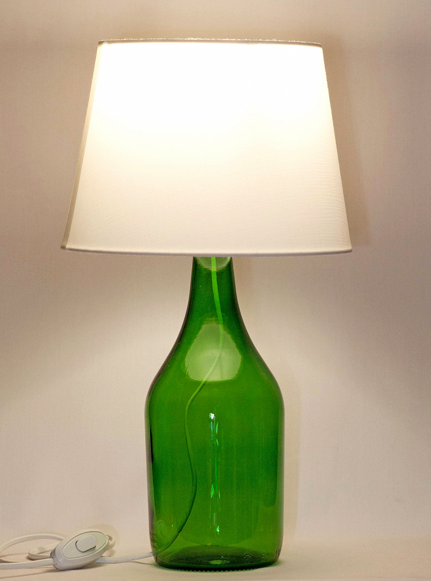 If there is nowhere to take a glass cutter, but you have a drill, you can make a lamp from a solid bottle. In this case, it will be possible to use only a small LED bayonet lamp in the form of a candle, which can crawl into the neck. Any bottle of any size is taken for manufacturing, in the bottom of which a hole is drilled for a cable, which is pulled through the neck. After installing the light bulbs, they start making a lampshade or decorate the bottle at their discretion.