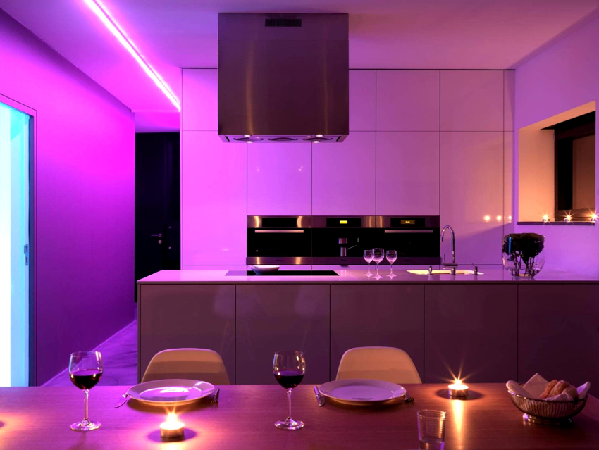 As decorative additional lighting in the kitchen, they use LED strip or lamps, neon pipes of different colors, fluorescent lamps. The backlight can be placed in different parts of the room, creating an original and unique room design. It can be located between the ceiling and wall cabinets of the kitchen set, on the basement of the furniture, on the refrigerator, in niches, above the cornice or working area.