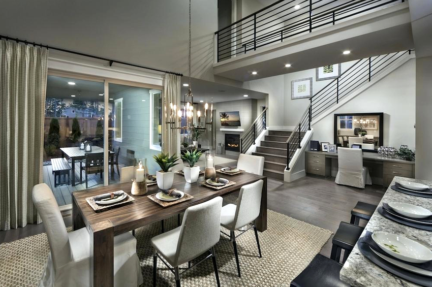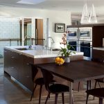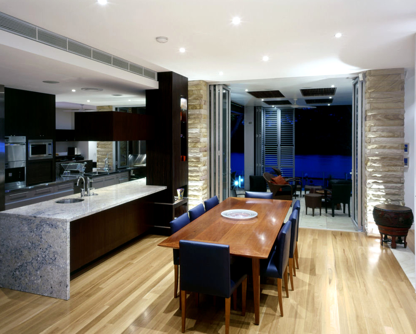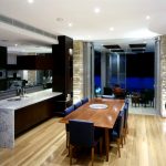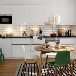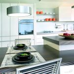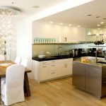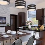 For a spacious kitchen, which is combined with a living room, a good option would be to organize built-in spot lighting, which will not only illuminate the dining area, but also become an element of dividing the space. A bus system with several lamps with a swivel structure above the dining area looks interesting in a modern interior. This is the preferred option for folding tables, as the swivel lighting systems allow you to adjust the direction of the light flow.