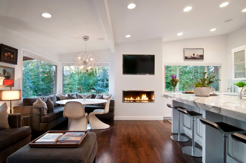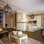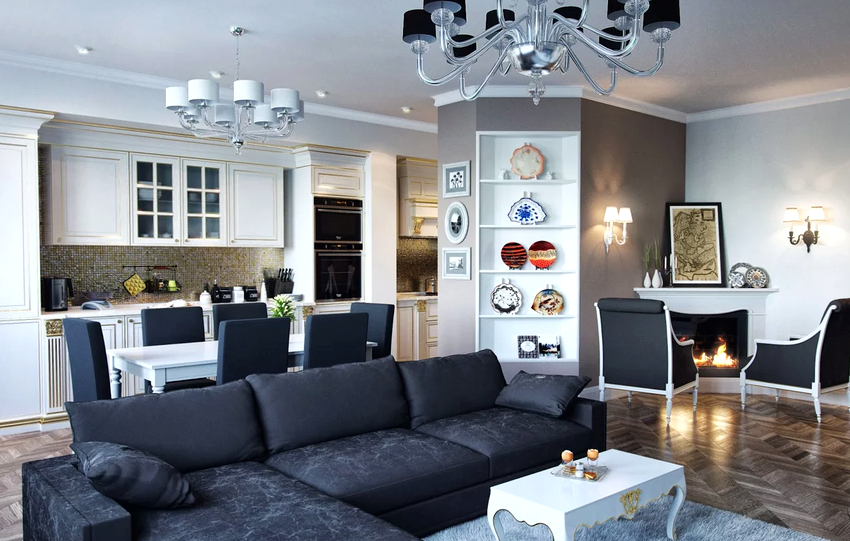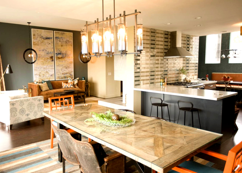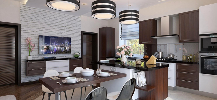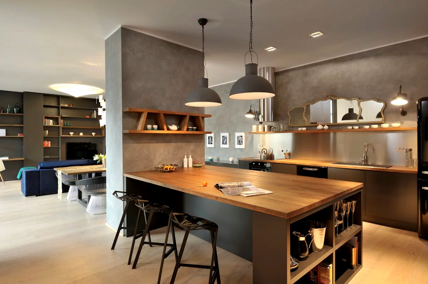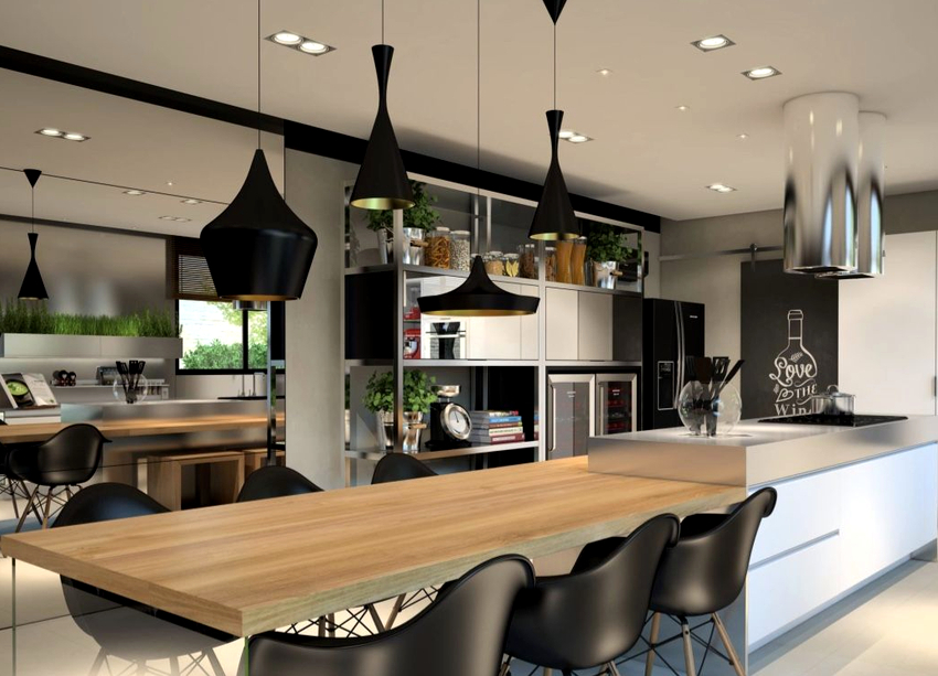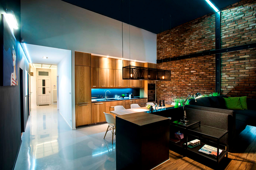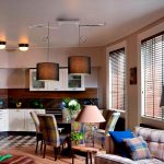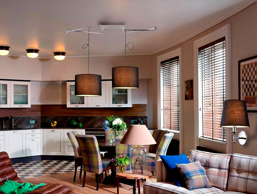 There are usually 2-3 functional zones in a studio kitchen. For each of them, it is necessary to organize individual lighting. To create a harmonious design of interconnected rooms, one should not forget about maintaining a single stylistic concept.