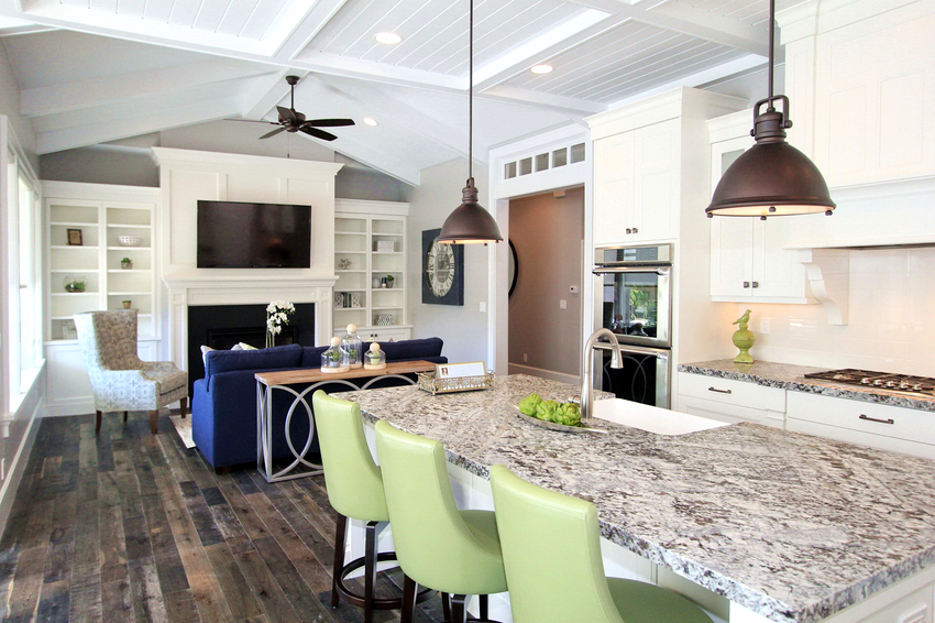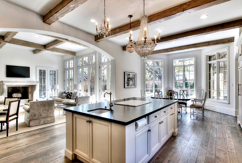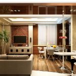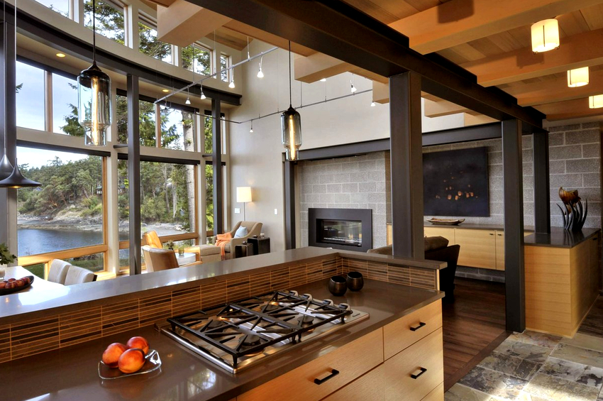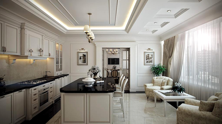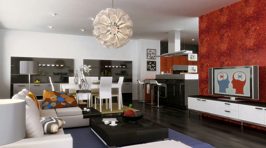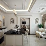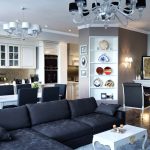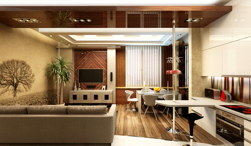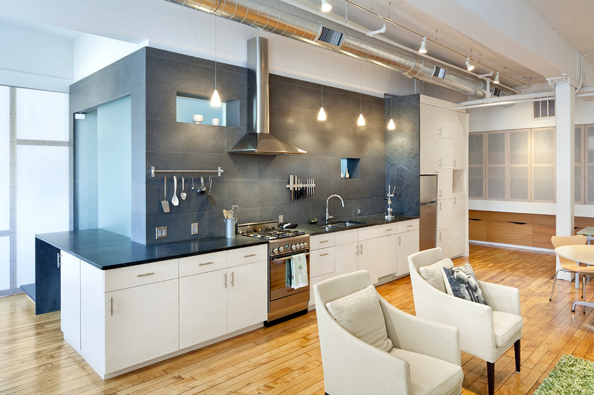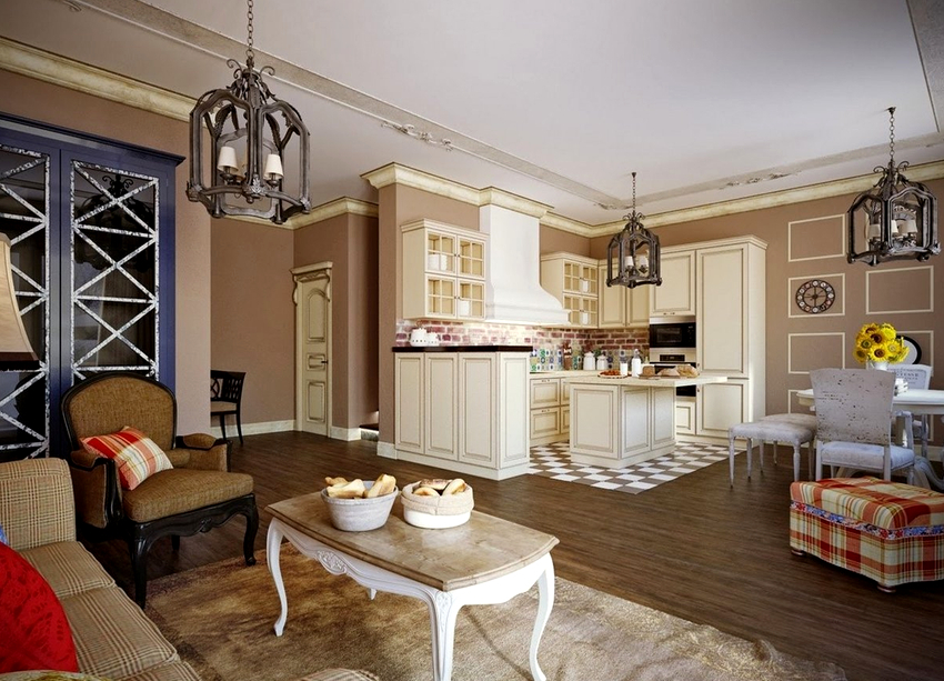 There are usually 2-3 functional zones in a studio kitchen. For each of them, it is necessary to organize individual lighting. To create a harmonious design of interconnected rooms, one should not forget about maintaining a single stylistic concept.
