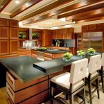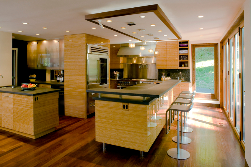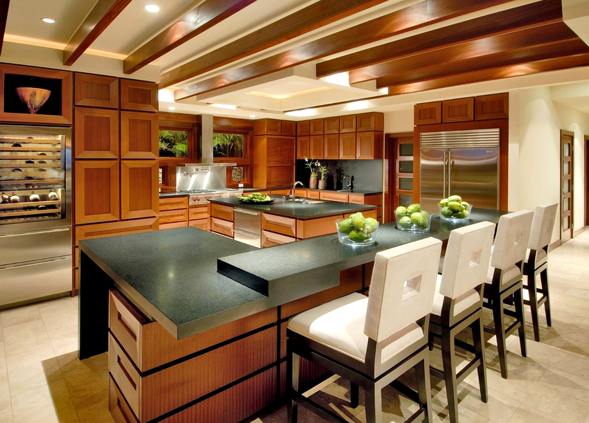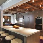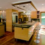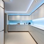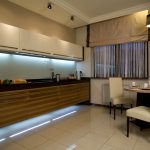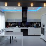 Another option involves the organization of backlighting located along the perimeter of the kitchen. This creates an incredible floating ceiling effect. In the case of creating a multi-level structure, lighting can be built into the shelf of the lower tier, decorating the ceiling. This option allows you to zone the room.