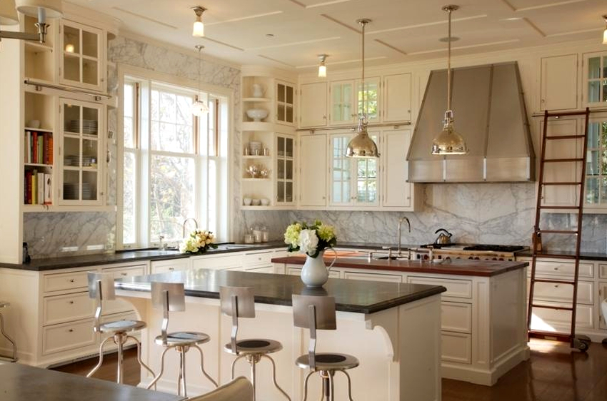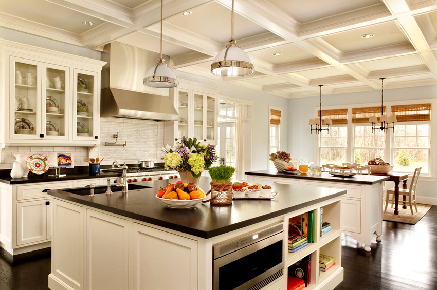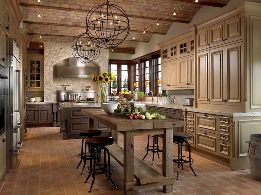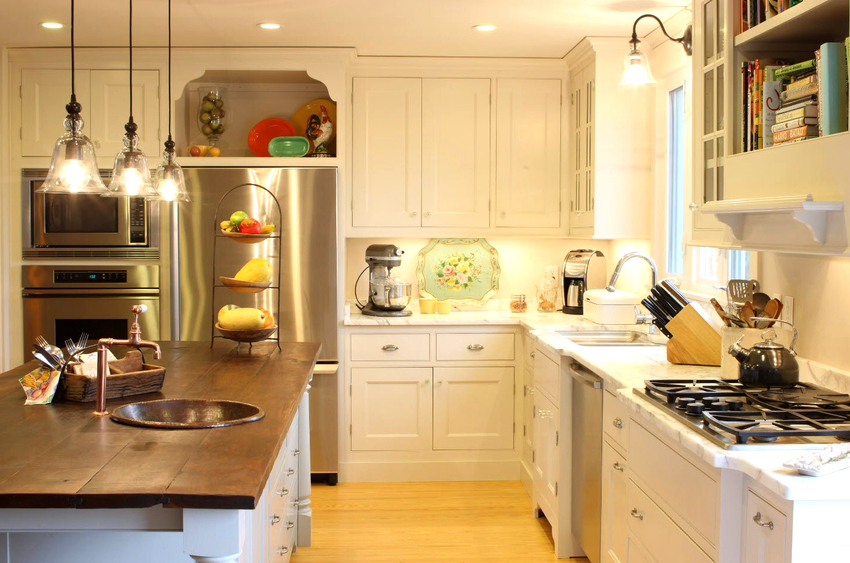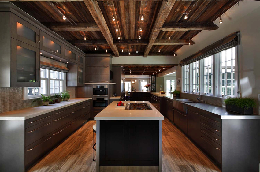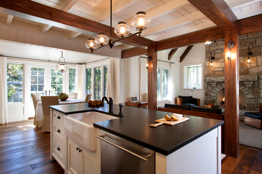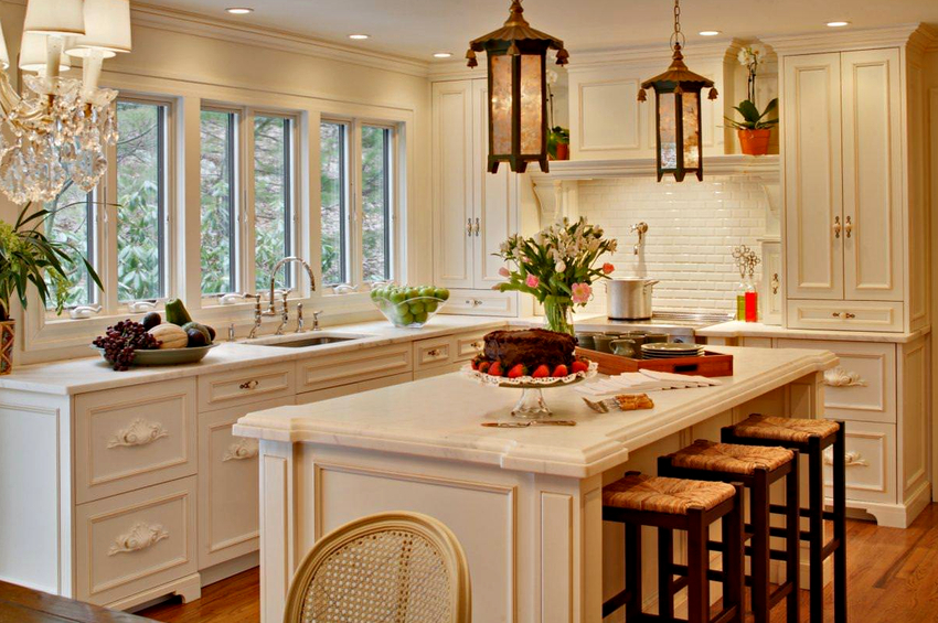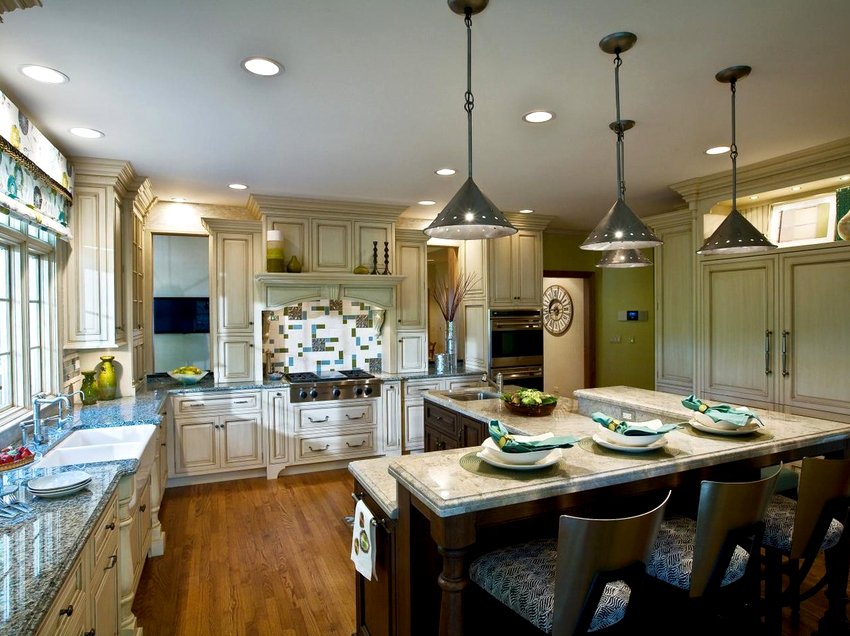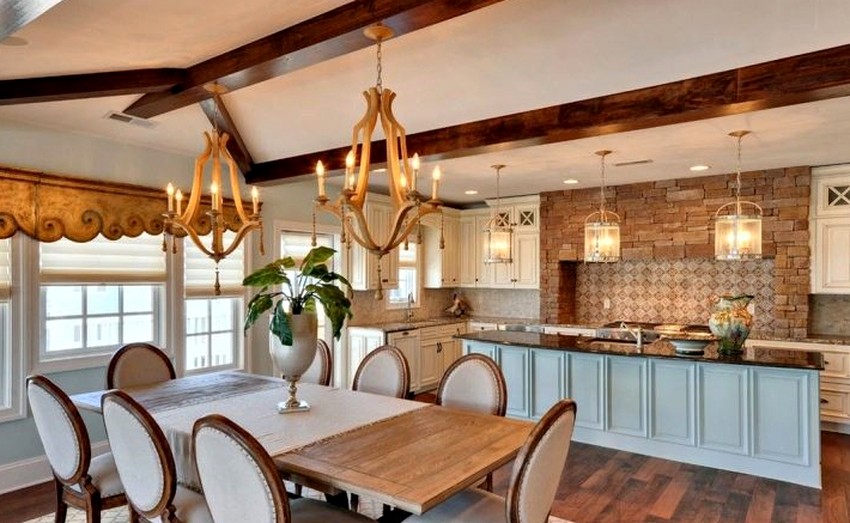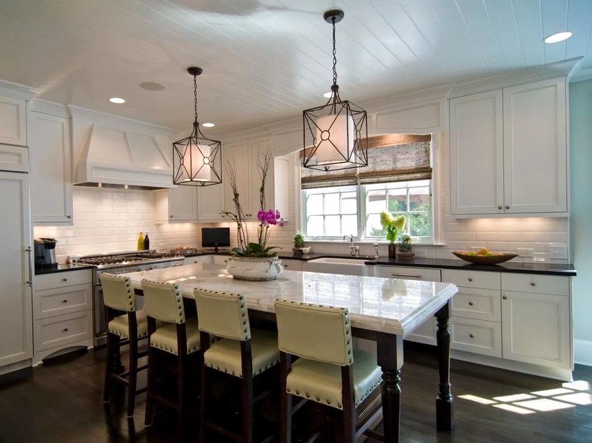 The traditional solution is to install the chandelier in the center of the kitchen ceiling. This option is appropriate for small spaces. If the kitchen has a low ceiling, it is better to give preference to ceiling options. In other cases, suspended structures are often used. In the photo of the lamps in the kitchen, you can consider interesting options for lighting the room.