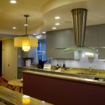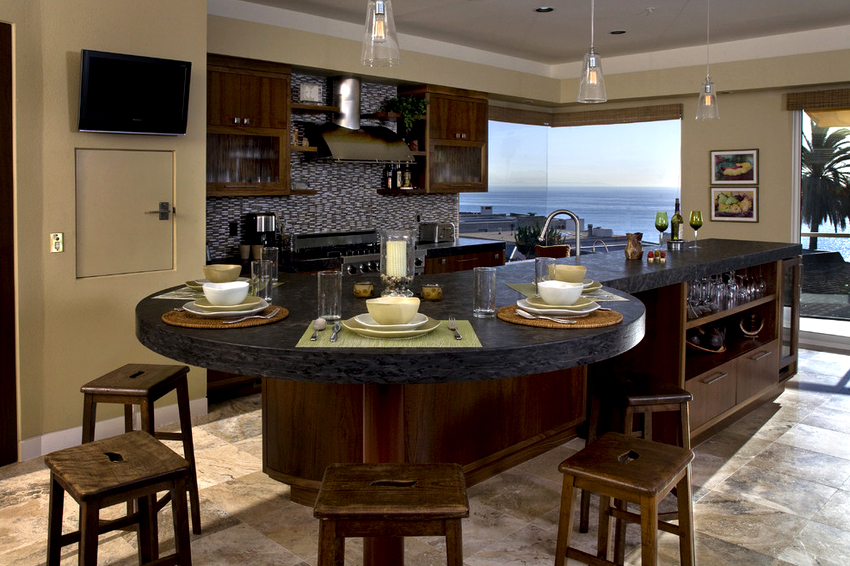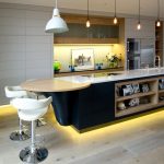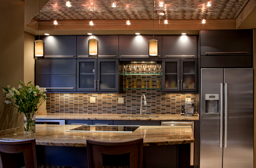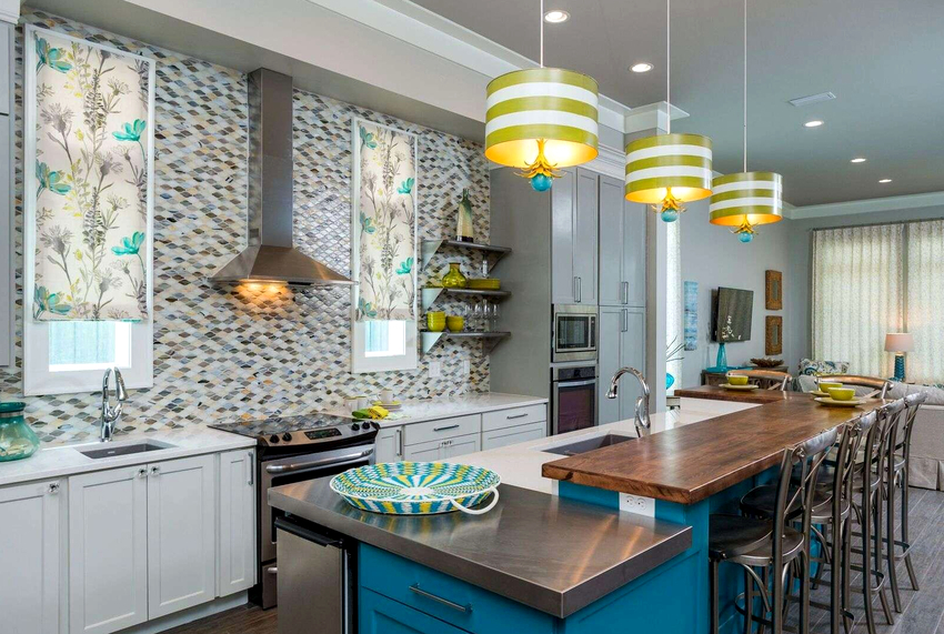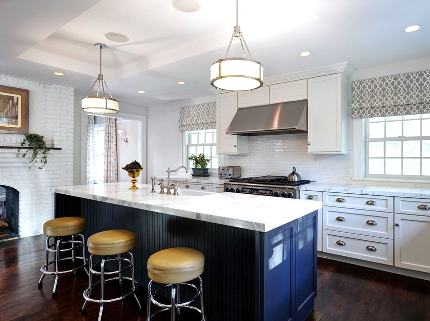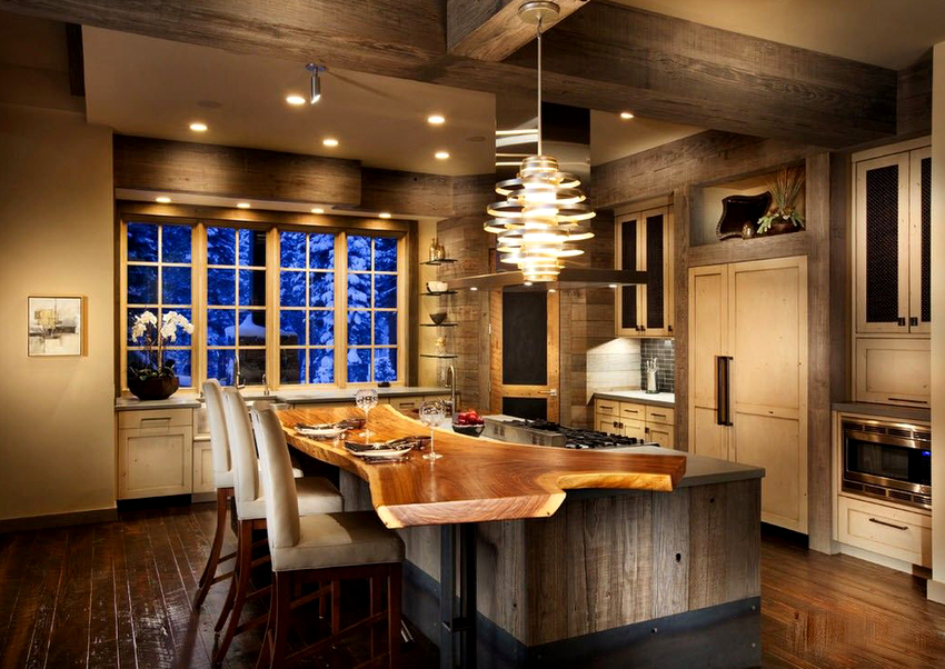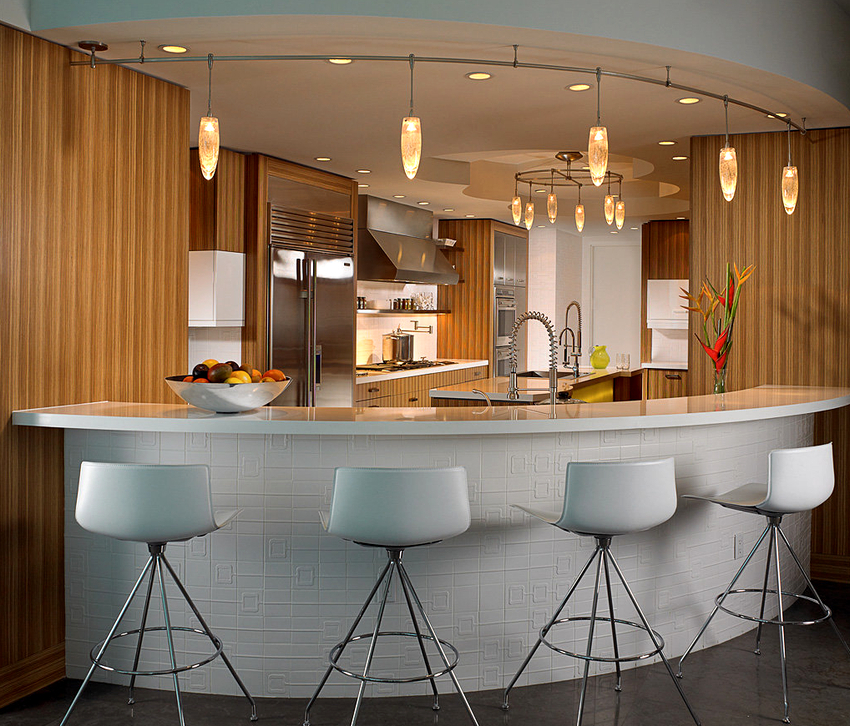 The location of the bar, its height, and external configuration are selected based on the type of the selected luminaire. The ideal option is such a solution when the light falls exclusively on the countertop, and not on other elements of the room.