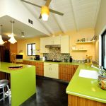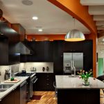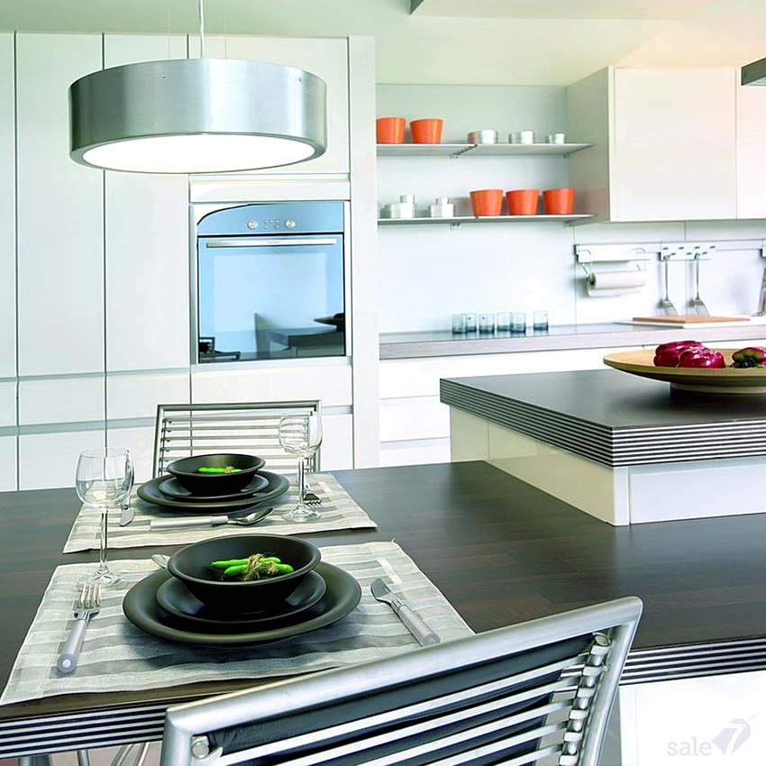 The overhead light is responsible for lighting the entire interior space of the room. It should be soft, uniform and diffused. Central lighting in the kitchen can be presented in several options. You can use a chandelier, pendant lamp, built-in spot, surface-mounted, bus light sources or LED lighting.