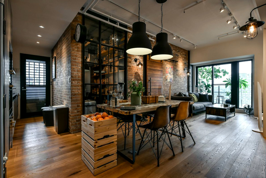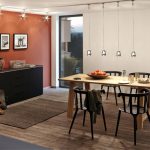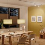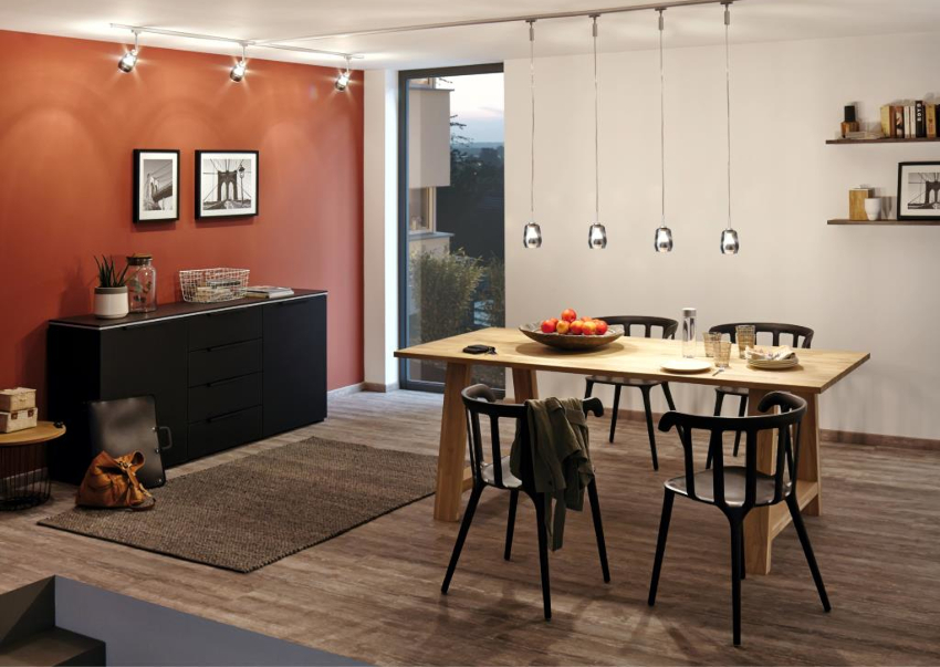 Above the dining area, it is advisable to place a pendant lamp in the kitchen or arrange floating lighting using a bus system. As an additional light source, a tall floor lampthat can be placed on the side of the table.