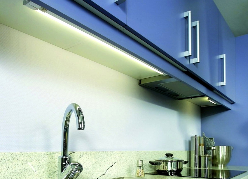 In addition to LED strips, there are models of lamps for the kitchen (the photo is a clear confirmation of this), represented by tubes. They are mounted on clips with magnetic fixing, which are mounted to furniture. When connecting LED strips and lamps to the mains, special adapters should be provided that provide the required voltage.